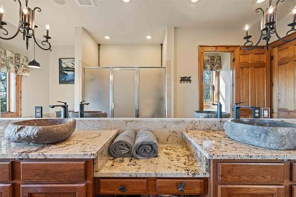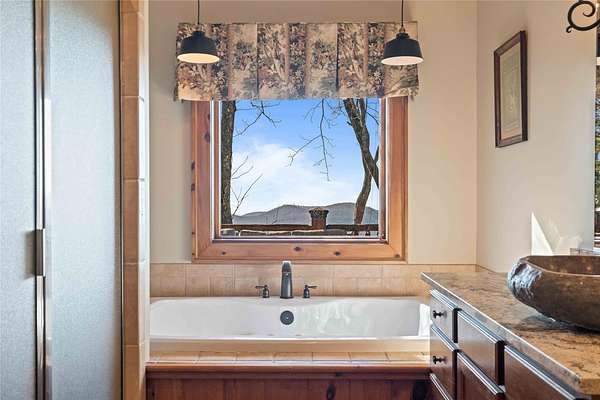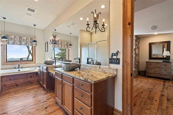 - Bar, Cathedral Ceilings, Ceiling Fans, Chandelier, Double Vanity, Eat In Kitchen, Entrance Foyer, High Ceilings, High Speed Internet, Jetted Tub, Kitchen Island, Open Floorplan, Pantry, Primary Downstairs, Separate Formal Dining Room, Soaking Tub, Stone Counters, Vaulted Ceilings, Walk In Closets