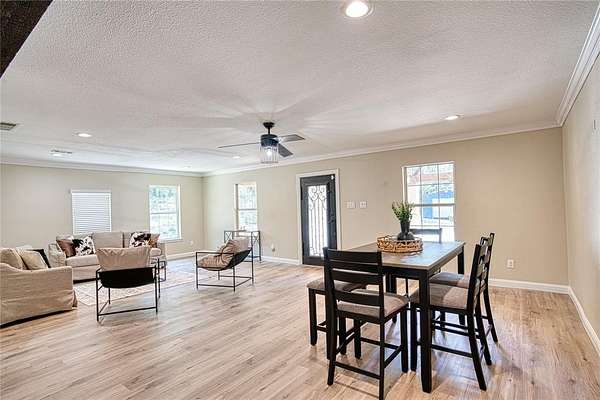 Past the gated entrance and circular drive, mature trees frame the home and create a private, welcoming setting. Inside, the open-concept layout offers clean lines, natural light, and upgraded finishes throughout. The kitchen is the heart of the home, featuring refreshed cabinetry, ample counter space, and a large central island that flows into spacious living and dining areas--perfect for entertaining or quiet evenings with family.