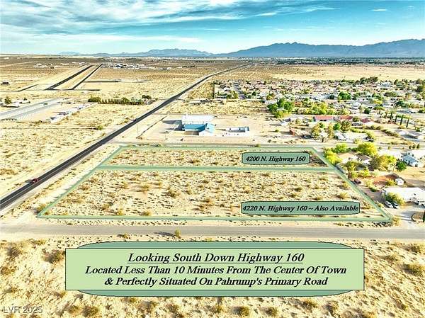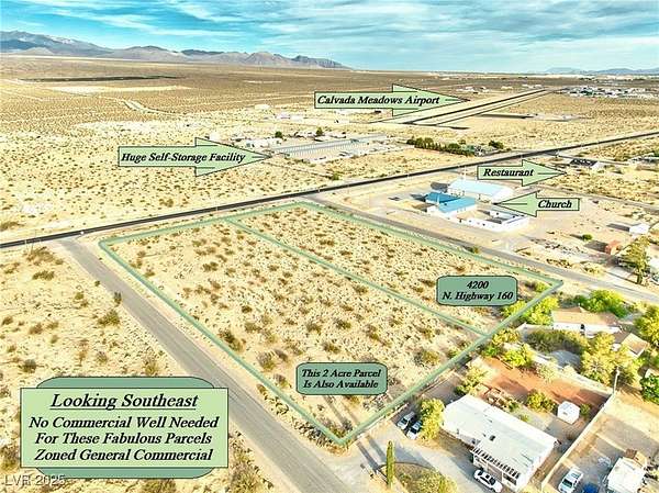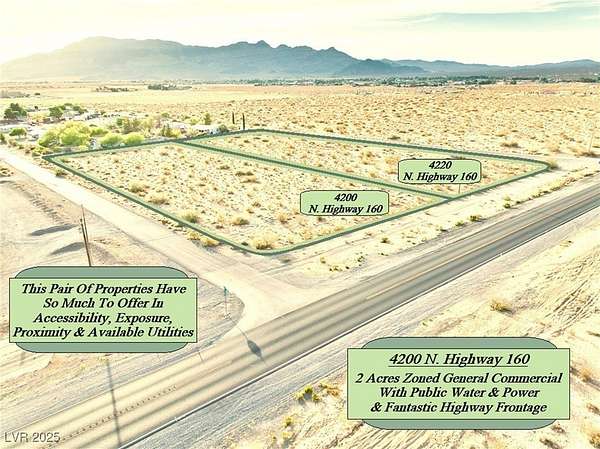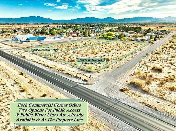 Outstanding Commercial Opportunity Awaits With This 2 Acre Corner Property Zoned General Commercial With Public Water Already At The Property Line~~~4200 N. Highway 160 Is Perfectly Situated In The Heart Of This Growing Northern Area Of Pahrump & Located 5 Minutes From The Center Of Town~~~The Adjoining Property At 4220 N. Highway 160 Is Also Available & Combined, They Offer 4 Fabulous Acres For Your Commercial Project~~~No Commercial Well Or Water Rights Needed For This Property, Public Water Lines Are Available At The Property Along With Power & It Is Zoned For Septic~~~This Corner Parcel Offer Access On Both Munsell Way & Highway 160 & The Possibilities For This & The Adjoining Parcel Are Tremendous~~~The Seller Will Finance (If Needed) With $50,000 Down & Payments For 10 Years~~~This Will Be The Home For A Prime Project, Do Not Let This One Get Away & Lock It In Today!