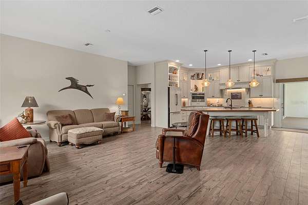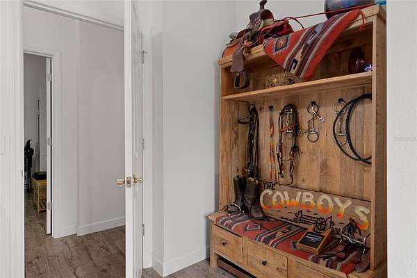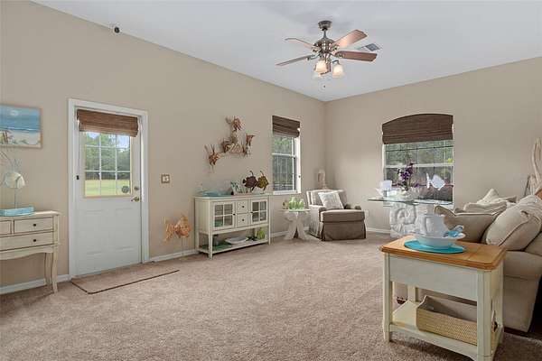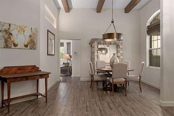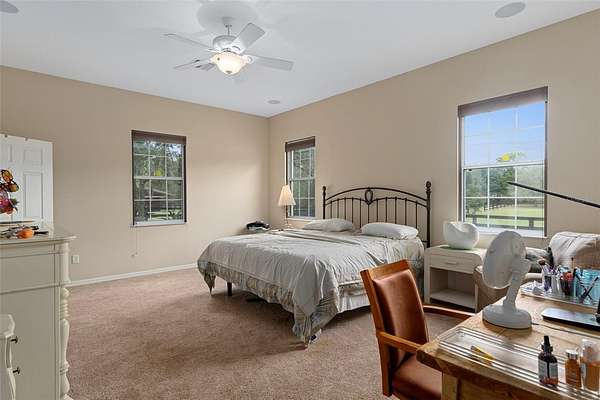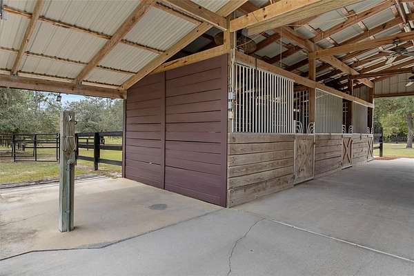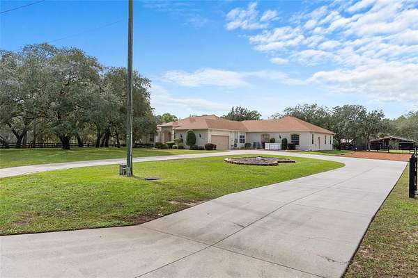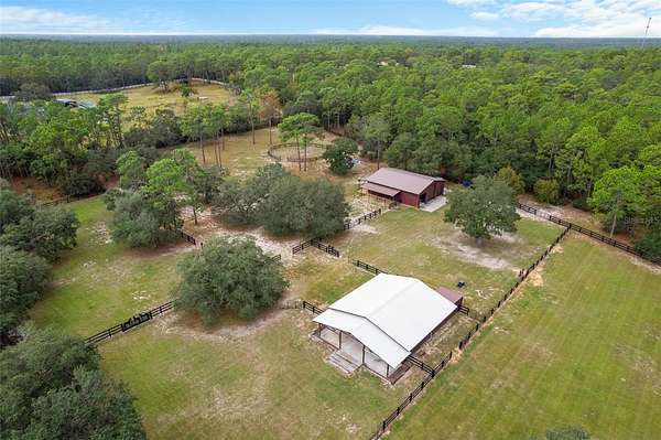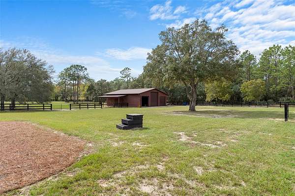 CUSTOM EQUESTRIAN ESTATE ON 7.39 ACRES OF IMPROVED PASTURE - Experience the perfect blend of LUXURY LIVING & EQUESTRIAN FUNCTIONALITY in this CUSTOM 5-BEDROOM (PLUS OFFICE), 3.5-BATH ESTATE designed for comfort, versatility, and connection to the land. With 2 PRIMARY SUITES, this home is ideal for MULTI-GENERATIONAL LIVING or accommodating a TRAINER OR STABLE HAND -- the secondary suite features a PRIVATE SIDE ENTRANCE that opens into the main living area with convenient access to the HORSE BARN. Step inside and you'll find ornate craftmanship and custom finishes throughout -- from WOOD-BEAMED CEILINGS in the formal living and dining rooms to the WOOD-LOOK TILE FLOORS that add warmth and elegance. HIGH CEILINGS & ABUNDANT NATURAL LIGHT create an expansive, open, and airy feel throughout the home. The real living areas overloook the SCREENED-IN POOL AND SPA, providing year-round enjoyment and a seamless indoor-outdoor flow. Beyond the pool, the property transitions beautifully into FENCED, IRRIGATED PADDOCKS leading to a 4-STALL CENTER-AISLE BARN equipped with everything a discerning horse owner needs including MULTIPLE WASH RACKS WITH HOT WATER, FEED ROOM & SEPARATE TACK ROOM, ADDITIONAL EQUIPMENT STORAGE, SLIDING CROSS-BUCK STALL DOORS AND FEED DOORS, & BARN DOORS OPENING DIRECTLY TO PADDOCKS for easy turnout. The 7 GRASS PASTURES are irrigated by a private well, making maintenance effortless. For additional training, there's a ROUND PEN, and behind the barn sits a 2,000 sq. ft. RV AND EQUIPMENT BARN with CONCRETE SLAB & ELECTRIC including 30 AMP & 50 AMP SERVICE. Backing directly to the 28-MILE PRIVATE HORSE TRAIL SYSTEM, this property offers quick trail access to the COMMUNITY EQUESTRIAN TRAINING CENTER featuring a large lighted RIDING ARENA, DRESSAGE ARENA, HUNT COURSE, & TRAIL COURSE. For those who compete or train regularly, it's a dream setup -- and just a short drive from OCALA'S WORLD EQUESTRIAN CENTER and FLORIDA HORSE PARK. Need more land? An ADDITIONAL 6.5-ACRE PARCEL is also available directly behind this property for expanded possibilities. This is a RARE OPPORTUNITY TO OWN A TRUE EQUESTRIAN LIFESTYLE ESTATE where LUXURY, LAND, & LOCATION unite perfectly. Don't wait too long on this EXCEPTIONAL VALUE -- properties offering this level of quality and equestrian infrastructure are few and far between.