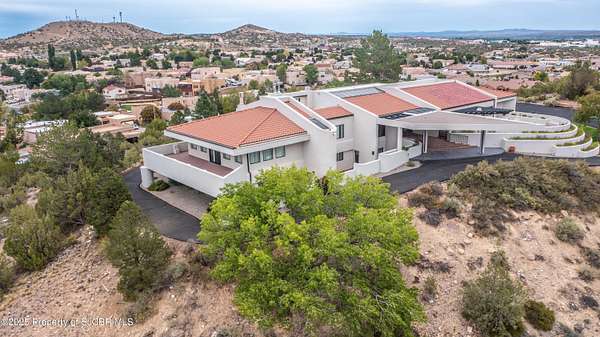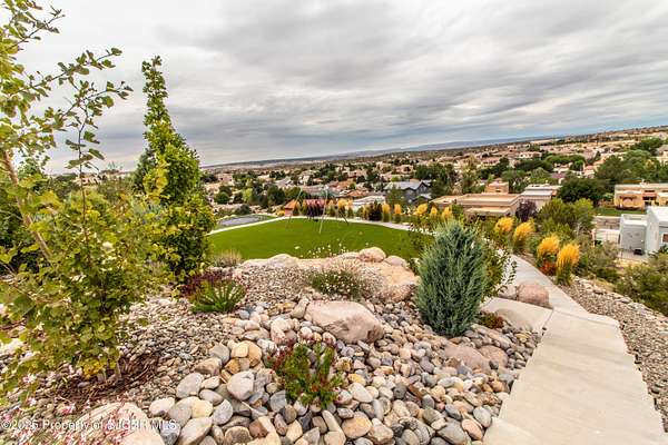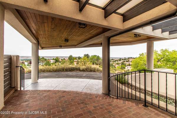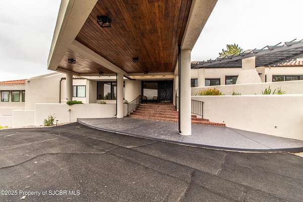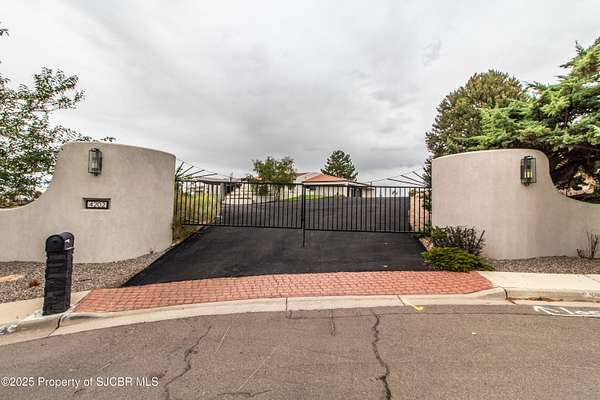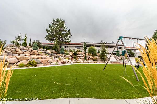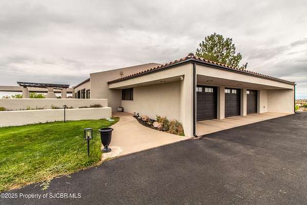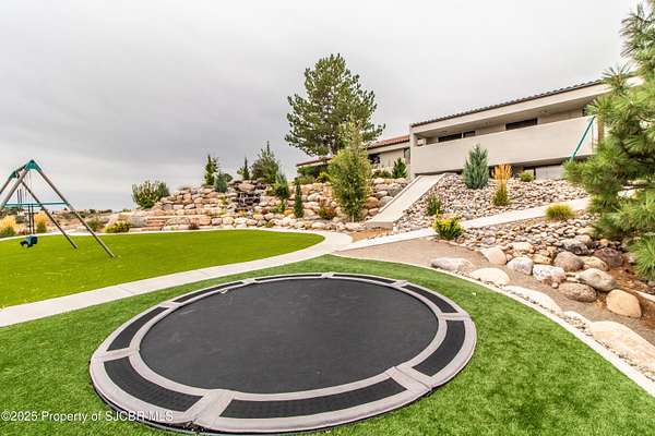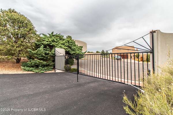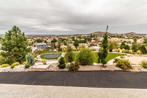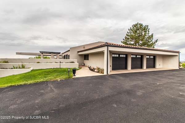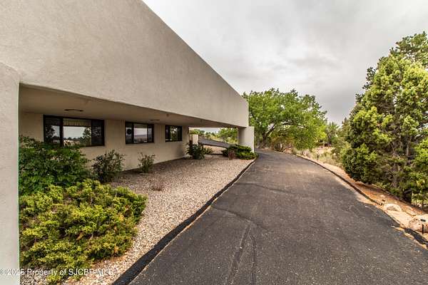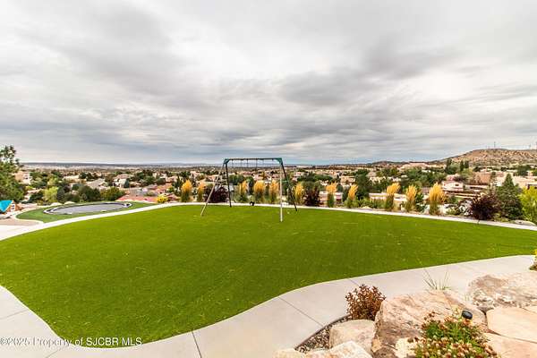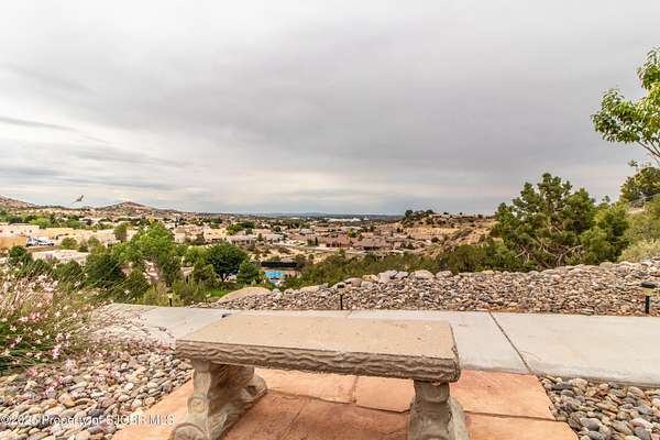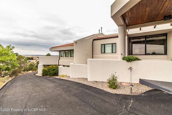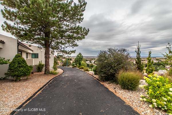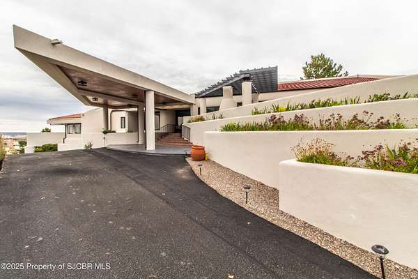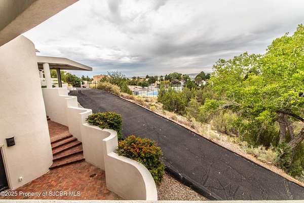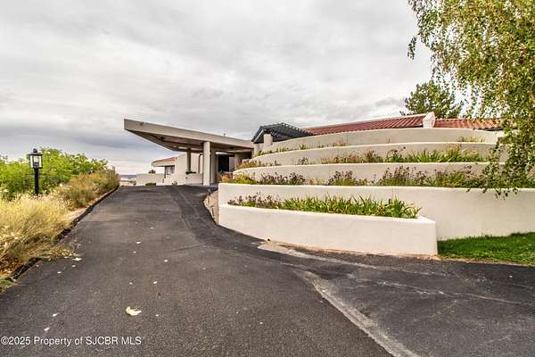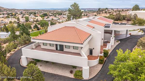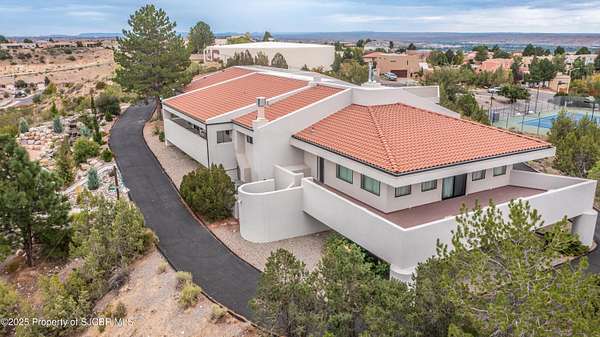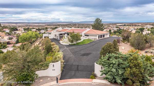 FRANK LLOYD WRIGHT INSPIRED CUSTOM CONSTRUCTION, SITUATED ON ONE OF THE HIGHEST PEAKS IN FARMINGTON! Seamless horizontal lines and extended eaves create a signature look to one of San Juan County's most unique and awe inspiring homes. Blended with the natural landscape, this property has incredible architectural features that enhance the feel and flow of the original design. Almost completely remodeled, the owners spared no expense when bringing their vision to a reality. Statement features include a dramatic cantilevered front eave that frames a unique entry complete with a beautifully designed ''one of a kind'' front door. Step inside the main hall to a raised ceiling foyer, accented by open air wood beams, wrought iron railings and all new luxury vinyl flooring. Incredible primary bedroom with en-suite bathroom, dual closets, additional built-ins, adjacent study with a true kiva style fireplace and private balcony to enjoy the Northerly views. A show stopping gourmet kitchen with solid stone countertops, butler pantry, beverage drawers, extra storage and high end appliances. Formal dining flows off the kitchen and is just steps to the great room below where the windows were intentionally positioned to capture the views of Shiprock, La Plata mountains and the incredible Southwest sunsets. At the heart of the home is a stacked stone gas log fireplace complete with a hearth and mantle. Lower level features an entire game room, additional stacked stone fireplace and family room plus additional bedrooms, solarium and workout center. INCREDIBLE outdoor living spaces including a fully designed yard space with a waterfall feature, bolder accents, zipline, walking paths, concrete slide, in-ground trampoline PLUS a private tennis/pickleball court for enjoyment. In-ground and enclosed pool that's been completely remodeled adds an additional level of entertaining possibilities! THIS HOME IS SO INCREDIBLE, AN ABSOLUTE MUST SEE!
