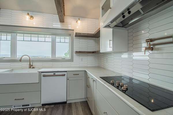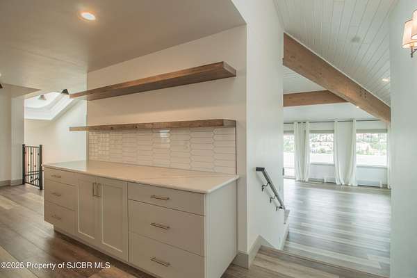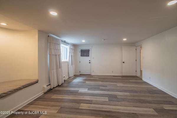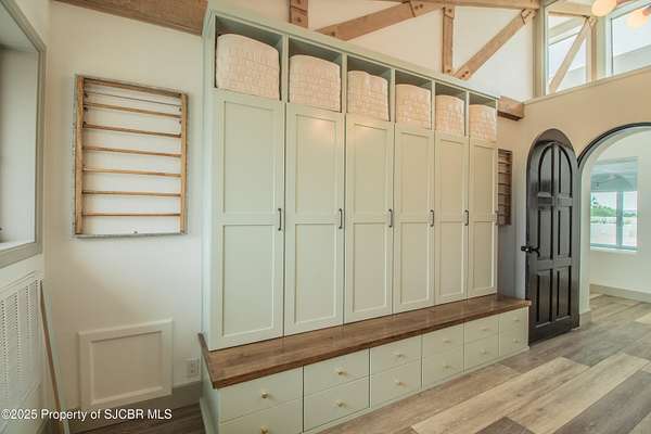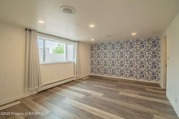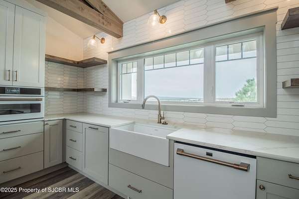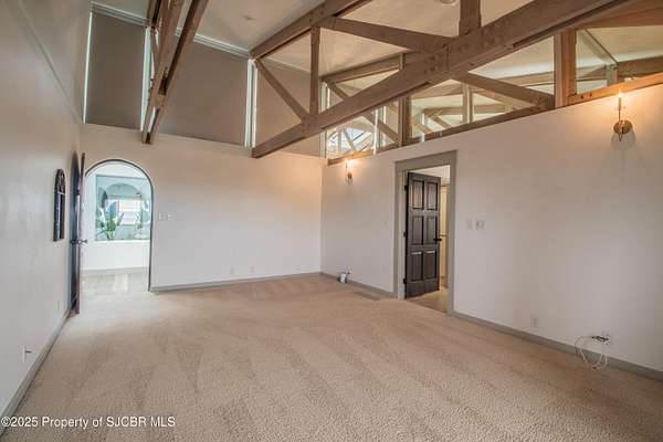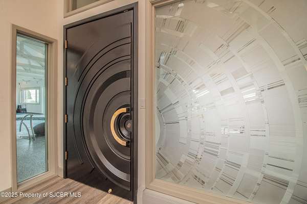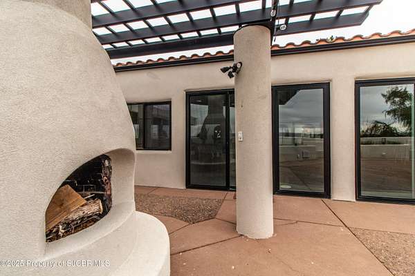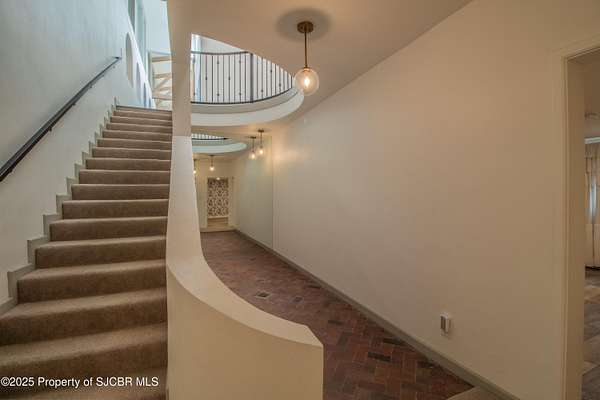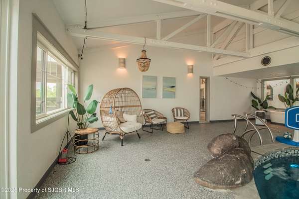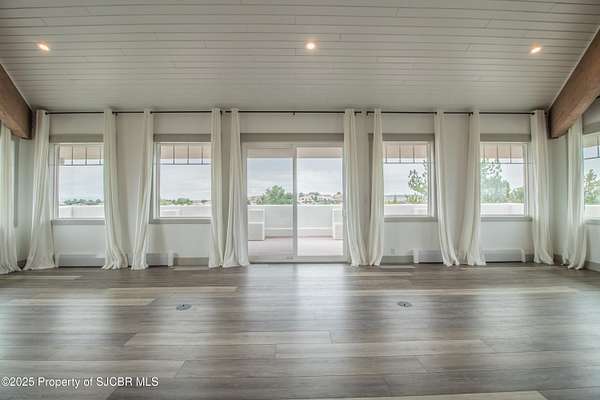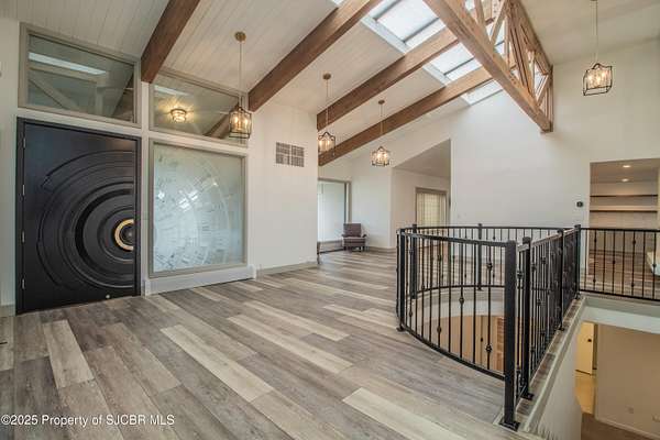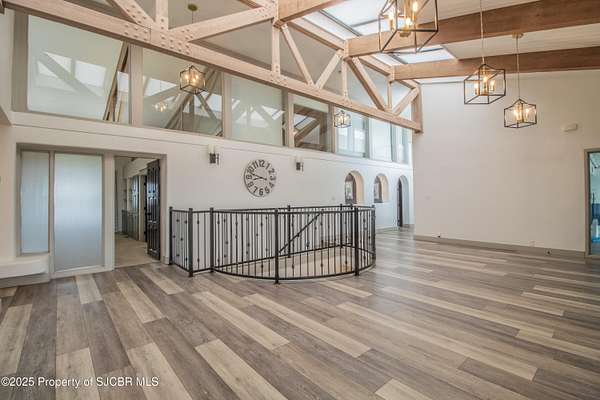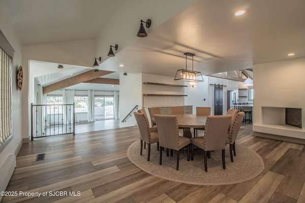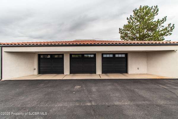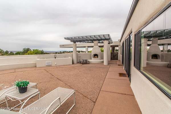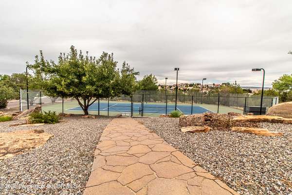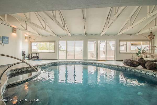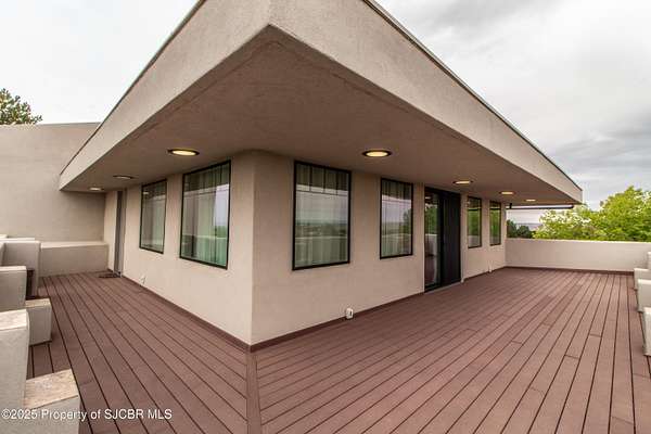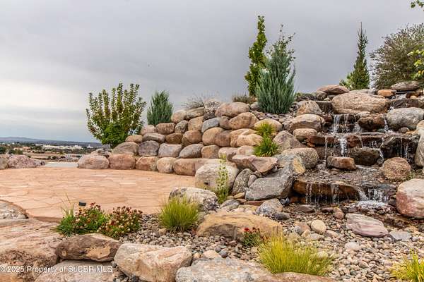 FRANK LLOYD WRIGHT INSPIRED CUSTOM CONSTRUCTION, SITUATED ON ONE OF THE HIGHEST PEAKS IN FARMINGTON! Seamless horizontal lines and extended eaves create a signature look to one of San Juan County's most unique and awe inspiring homes. Blended with the natural landscape, this property has incredible architectural features that enhance the feel and flow of the original design. Almost completely remodeled, the owners spared no expense when bringing their vision to a reality. Statement features include a dramatic cantilevered front eave that frames a unique entry complete with a beautifully designed ''one of a kind'' front door. Step inside the main hall to a raised ceiling foyer, accented by open air wood beams, wrought iron railings and all new luxury vinyl flooring. Incredible primary bedroom with en-suite bathroom, dual closets, additional built-ins, adjacent study with a true kiva style fireplace and private balcony to enjoy the Northerly views. A show stopping gourmet kitchen with solid stone countertops, butler pantry, beverage drawers, extra storage and high end appliances. Formal dining flows off the kitchen and is just steps to the great room below where the windows were intentionally positioned to capture the views of Shiprock, La Plata mountains and the incredible Southwest sunsets. At the heart of the home is a stacked stone gas log fireplace complete with a hearth and mantle. Lower level features an entire game room, additional stacked stone fireplace and family room plus additional bedrooms, solarium and workout center. INCREDIBLE outdoor living spaces including a fully designed yard space with a waterfall feature, bolder accents, zipline, walking paths, concrete slide, in-ground trampoline PLUS a private tennis/pickleball court for enjoyment. In-ground and enclosed pool that's been completely remodeled adds an additional level of entertaining possibilities! THIS HOME IS SO INCREDIBLE, AN ABSOLUTE MUST SEE!