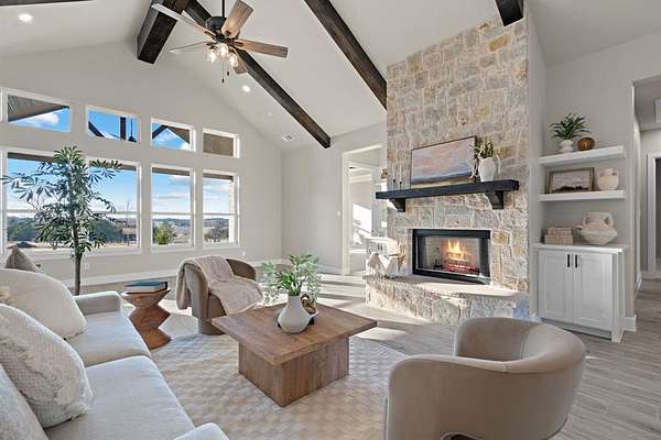 A striking stone facade and grand covered entry create a lasting first impression, setting the tone for the elevated design found throughout the home. Inside, soaring vaulted ceilings with architectural detail and a dramatic floor-to-ceiling stone fireplace anchor the main living space, creating a warm yet impressive focal point. Expansive windows frame serene countryside views while flooding the interior with natural light, enhancing the home's airy and open ambiance.