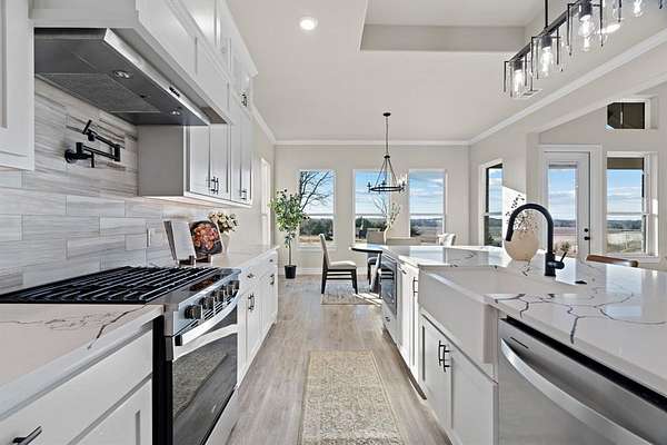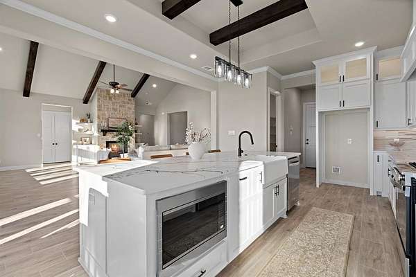 - Built-In Features, Chandelier, Decorative Lighting, Kitchen Island, Open Floorplan, Pantry