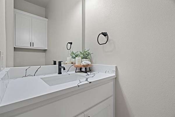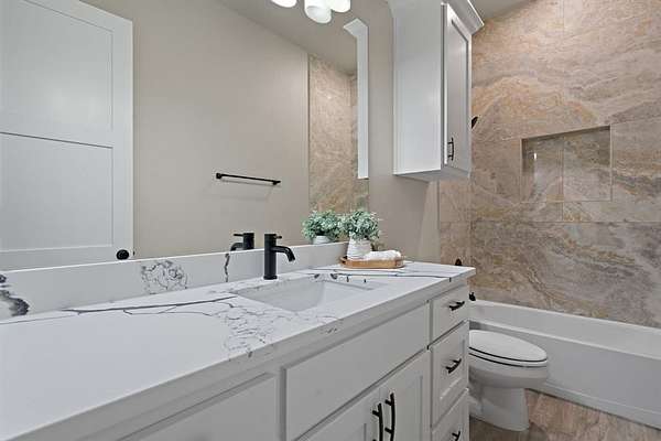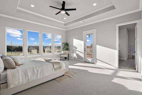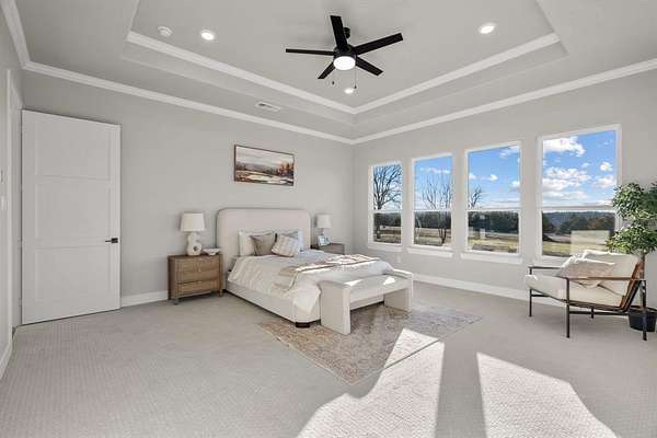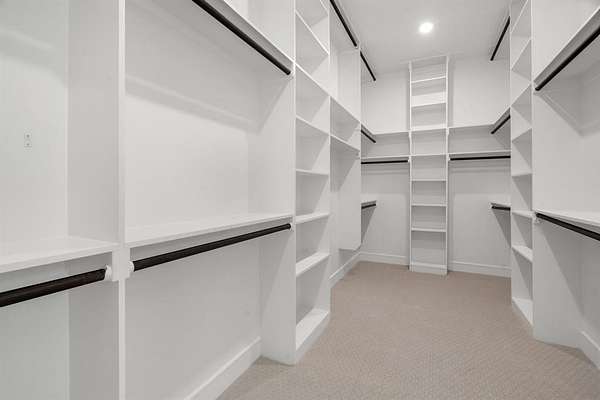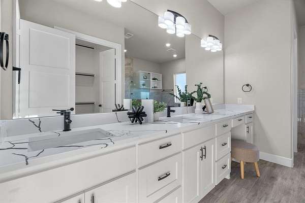 The primary suite is a luxurious retreat, complete with private patio access, a custom oversized walk-in closet, dual vanities, a spa-inspired walk-in shower, and an elegant soaking tub designed for ultimate relaxation.