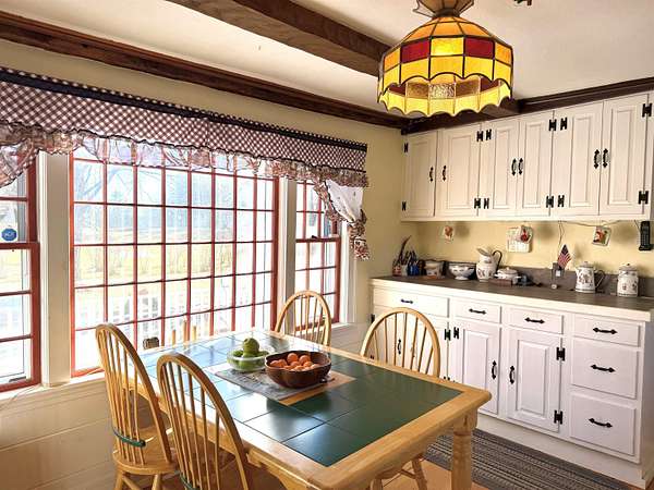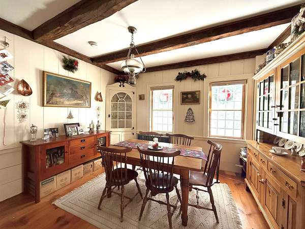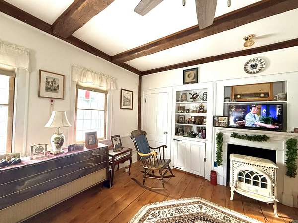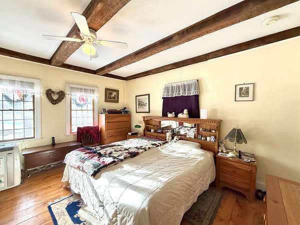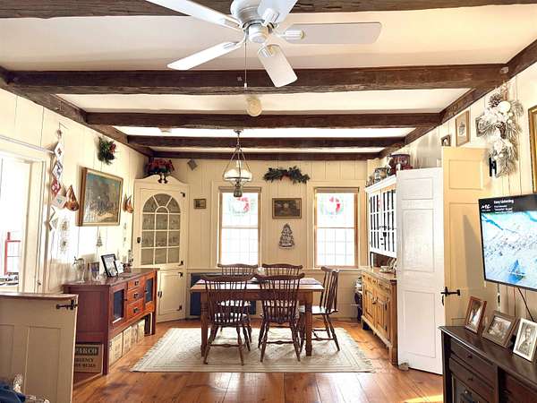 Step into timeless New England charm with this historic circa-1760s expanded Cape, offering a wonderful blend of early craftsmanship, character, and modern-day livability. The home showcases classic timber frame construction with hand hewn beams, beautiful wide plank floors, and preserved period details that create warmth and authenticity throughout every room. With three bedrooms and two full bathrooms, the layout includes a highly desirable first floor primary bedroom and bath, allowing for convenient single level living while still providing flexible space for family, guests, or a home office. Set on an expansive 15.55 acre parcel, the property captures scenic mountain views, open space, and a peaceful rural setting. The land features 47 established blueberry bushes and offers endless possibilities for gardening, agricultural pursuits, equestrian use, or simply enjoying the privacy and natural beauty of the countryside. A fantastic paved driveway provides easy year round access and leads to an oversized four car garage with abundant space for vehicles, tools, and storage. In addition, a separate three and a half car garage and a large barn greatly enhance the property's versatility, making it ideal for car collectors, hobbyists, workshops, creative studios, or expanded storage needs. One of the most captivating features is the large scenic pond, complete with a charming, renovated boathouse perfect for peaceful mornings with coffee, quiet afternoons by the water, or memorable outdoor gatherings with friends and family. Ideally located just 10 minutes from the base of Mount Ascutney for hiking and year-round outdoor adventure, and within 25 minutes of Okemo Mountain and other ski destinations, this unique property offers the perfect balance of historic character, natural beauty, and recreation.