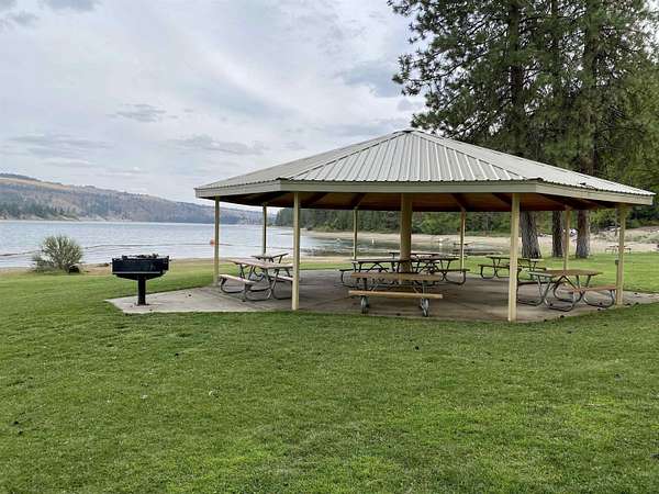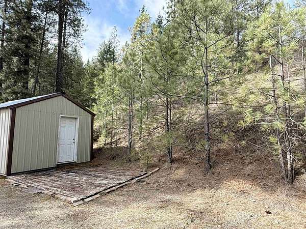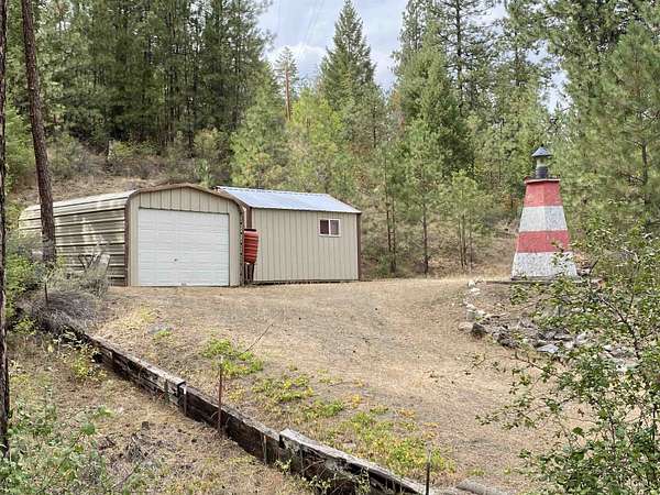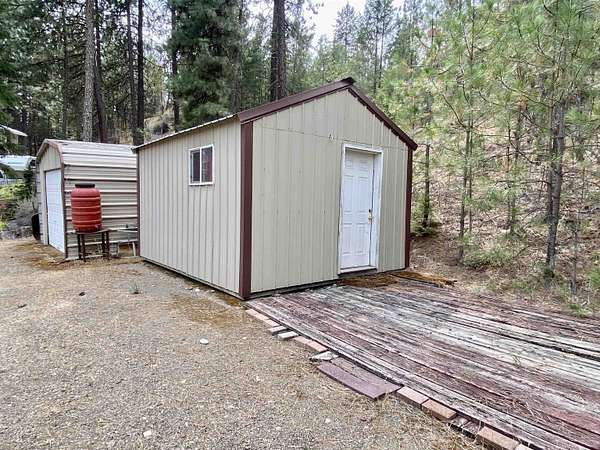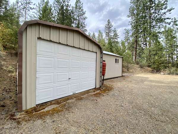 Lucky you, lake life can be yours just 2 minutes from the Lake Roosevelt Spokane Arm Porcupine Bay boat launch, beach, campground, picnic area, and swimming area, this property offers unparalleled convenience for water enthusiasts. Never worry about not having reservations, this is your saved camping spot that you always know is there for you. Paved roads all the way. Walkable trail right across the street leads to a quiet beach, perfect for relaxation and recreation. The property features a 25'x12' metal garage with a 9'6"x7' roll-up door, ideal for storing your boat. Additionally, a 15x12 storage shed, currently set up as a bunkhouse, provides a sleeping niche or extra space for storage. This recreation lot has been used for boat and RV parking with a 30' RV getting into place and able to turn around on the level portion. Inland power meter at the driveway, talk to Inland about options for power.