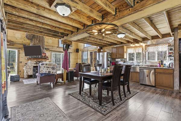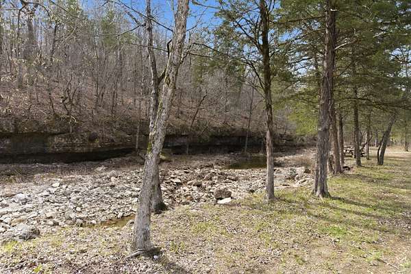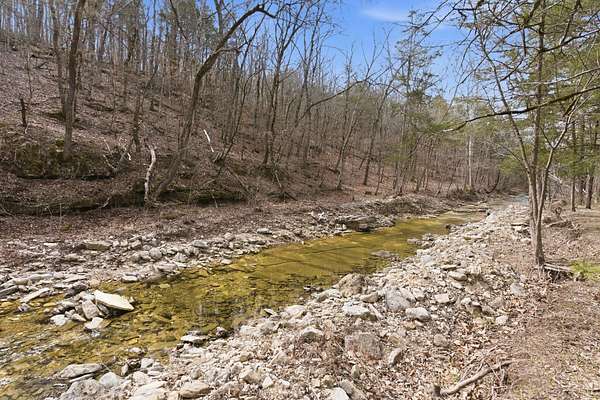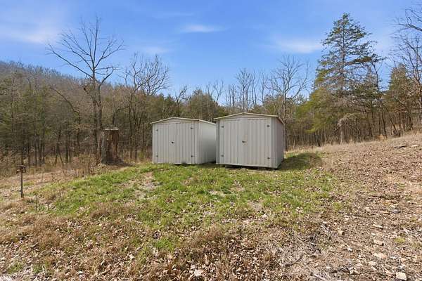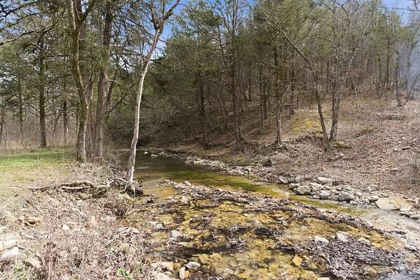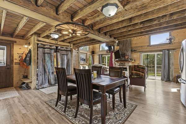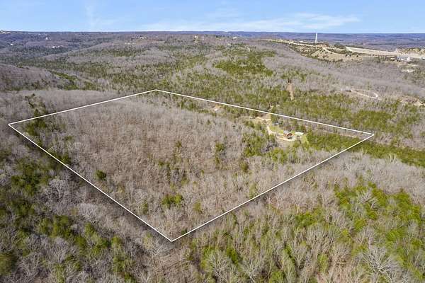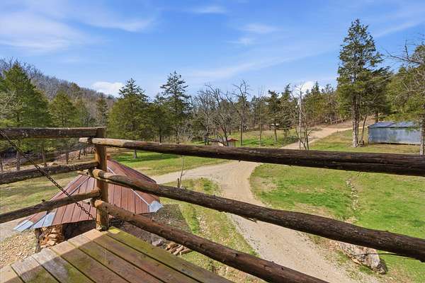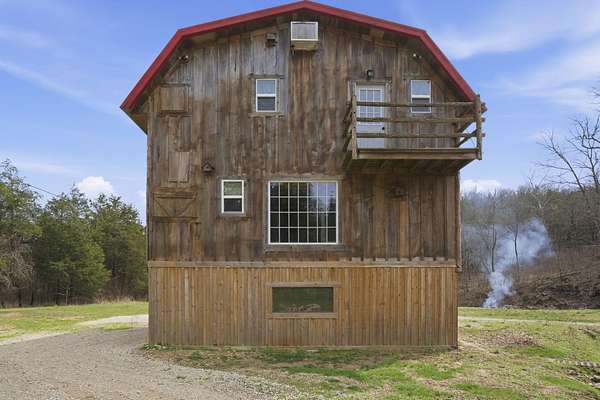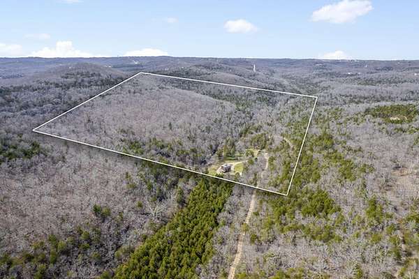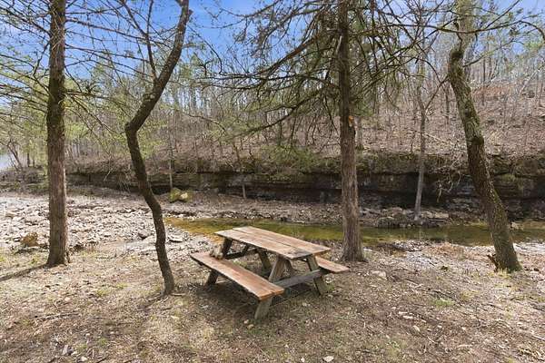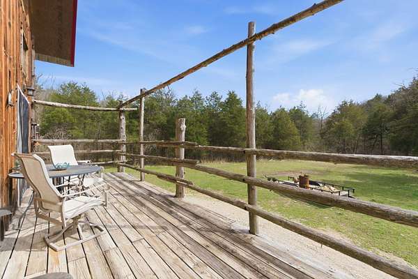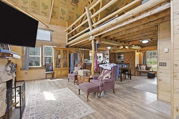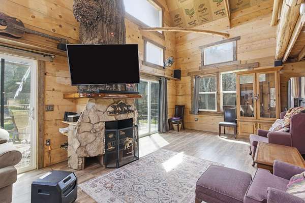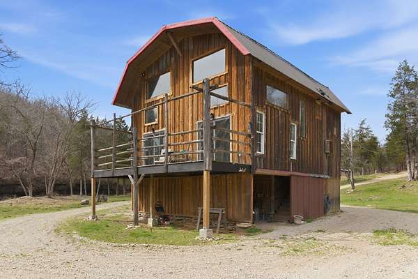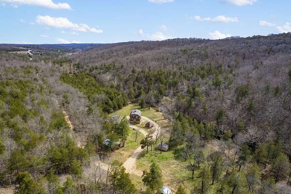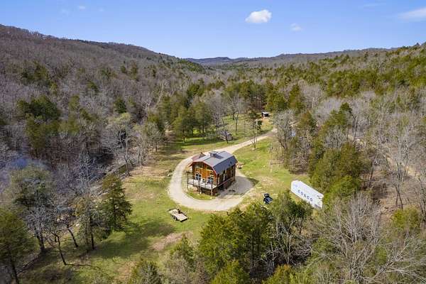 Tucked away on 40 beautiful acres in Walnut Shade, this charming log cabin offers an incredible opportunity for those seeking privacy, natural beauty, and room to grow. Just minutes from Branson and with convenient access to Hwy 65, this property blends seclusion with accessibility while offering exciting potential for expansion or development. Emory Creek winds through the land, creating a peaceful, park like setting complete with seasonal waterfalls and abundant wildlife, making it ideal for recreation, hunting, or future vision. The property is already equipped with valuable infrastructure including multiple electric meters, well water, septic systems, and an RV hookup, providing a strong foundation for additional homes, cabins, or investment opportunities. The home welcomes you with a bright, open floor plan and a warm, inviting living room featuring an electric fireplace topped with a striking tree that reaches the vaulted ceiling, creating a one of a kind treehouse feel. Natural light pours in through a wall of windows and double sliding doors, showcasing the surrounding landscape. The kitchen features stainless steel appliances, an attached dining area, and a charming wagon wheel light fixture, along with a nearby powder room and convenient laundry closet. Upstairs, the spacious primary bedroom offers beautiful wooden floors and an en-suite bathroom with a large walk in tiled shower. Step outside to enjoy a covered firepit area perfect for gathering, along with a covered parking space for a vehicle or tractor, multiple storage sheds, and even a deer stand already in place. Whether you envision a private retreat, a multi-home homestead, or a future income producing property, this acreage is ready to bring your vision to life.