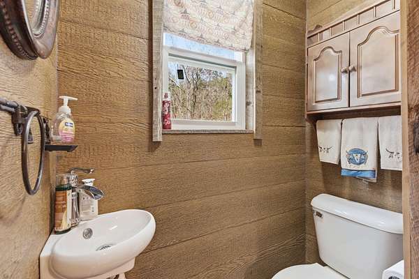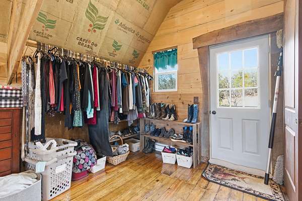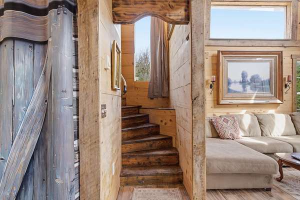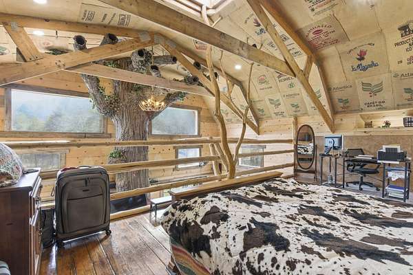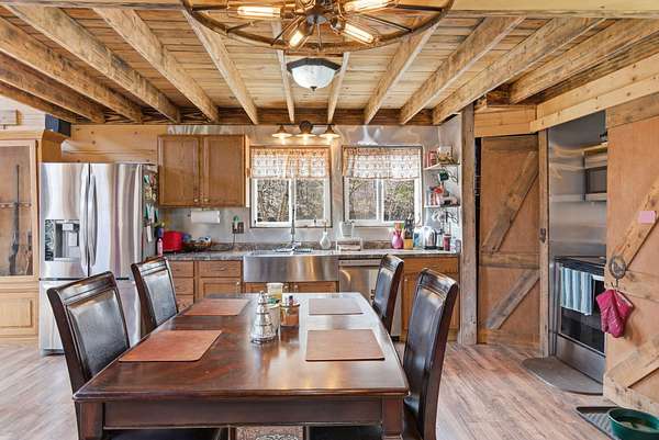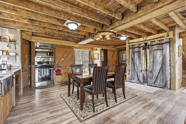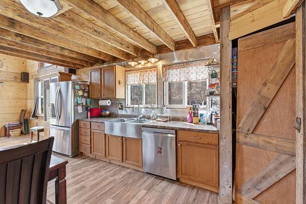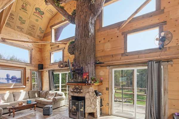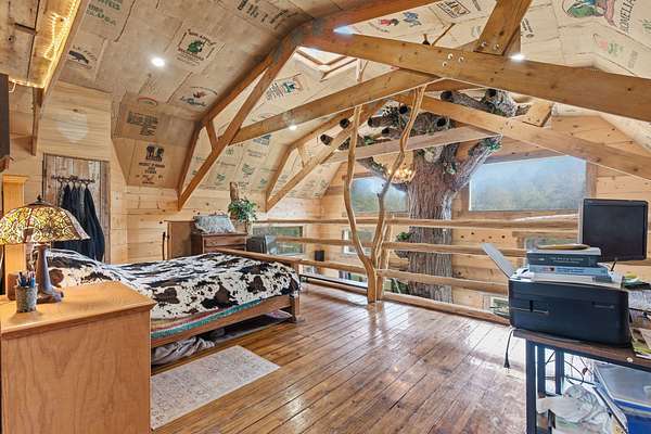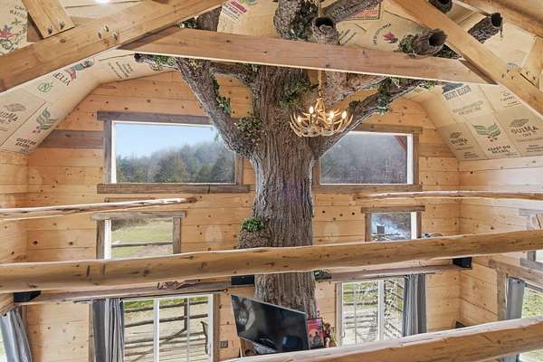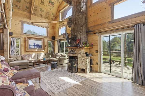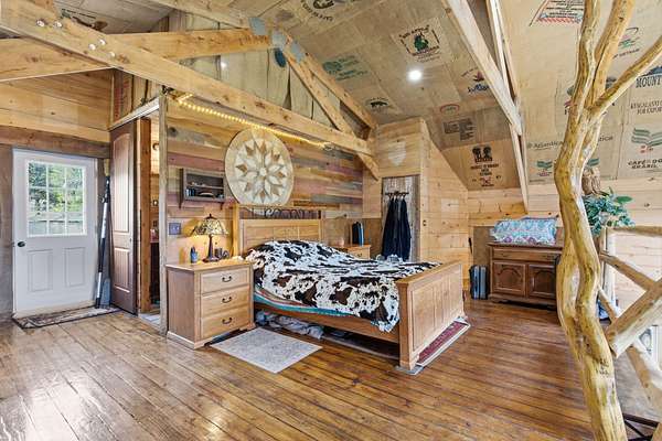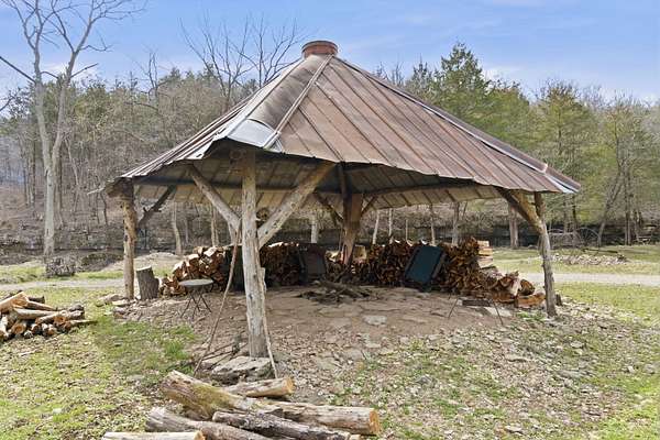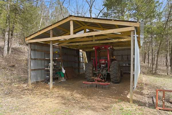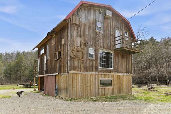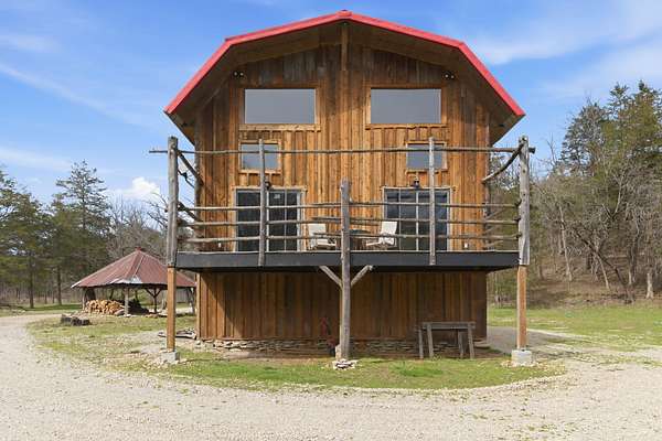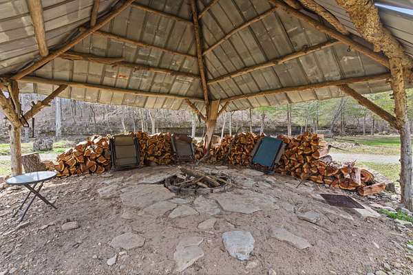 Tucked away on 40 beautiful acres in Walnut Shade, this charming log cabin offers an incredible opportunity for those seeking privacy, natural beauty, and room to grow. Just minutes from Branson and with convenient access to Hwy 65, this property blends seclusion with accessibility while offering exciting potential for expansion or development. Emory Creek winds through the land, creating a peaceful, park like setting complete with seasonal waterfalls and abundant wildlife, making it ideal for recreation, hunting, or future vision. The property is already equipped with valuable infrastructure including multiple electric meters, well water, septic systems, and an RV hookup, providing a strong foundation for additional homes, cabins, or investment opportunities. The home welcomes you with a bright, open floor plan and a warm, inviting living room featuring an electric fireplace topped with a striking tree that reaches the vaulted ceiling, creating a one of a kind treehouse feel. Natural light pours in through a wall of windows and double sliding doors, showcasing the surrounding landscape. The kitchen features stainless steel appliances, an attached dining area, and a charming wagon wheel light fixture, along with a nearby powder room and convenient laundry closet. Upstairs, the spacious primary bedroom offers beautiful wooden floors and an en-suite bathroom with a large walk in tiled shower. Step outside to enjoy a covered firepit area perfect for gathering, along with a covered parking space for a vehicle or tractor, multiple storage sheds, and even a deer stand already in place. Whether you envision a private retreat, a multi-home homestead, or a future income producing property, this acreage is ready to bring your vision to life.