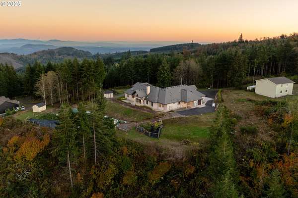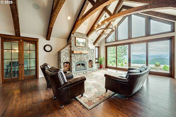 Panoramic mountain and territorial views with a custom-built 2019 luxury estate, offering 4,830 square feet on over 10 acres. Thoughtfully designed with hardwood floors throughout, vaulted timber framing, and a high efficiency wood-burning fireplace. The entertainer's kitchen features high-end built-in appliances and an oversized island. The primary suite is a private retreat with a propane fireplace, jetted tub, roll-in shower, and a spacious walk-in closet with custom built-ins. Flexible living spaces also include a music room, workout room, office, bonus room, a fully equipped theater room and tons of storage. Smart home technology pairs with environmentally conscious design, including low EMF wiring, a whole-house generator, advanced water and air purification systems, and exceptional energy efficiency. Outdoor amenities include a 17x84 geothermal greenhouse, organic fruit tree orchard and garden, 3 outdoor hydrants, dog run, EV charging in the oversized garage, and grounds designed for privacy and sustainability.