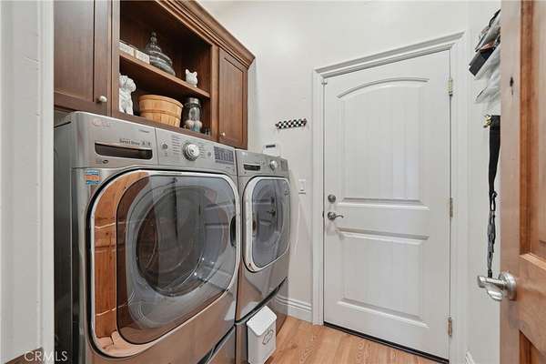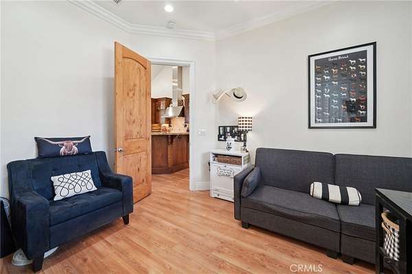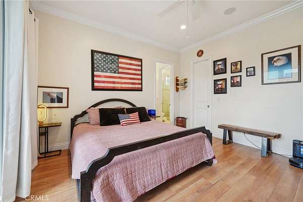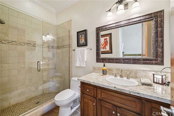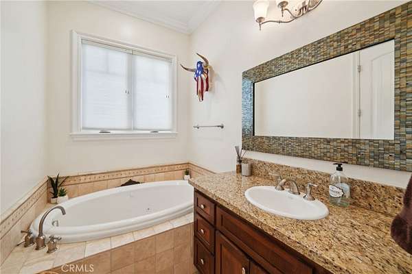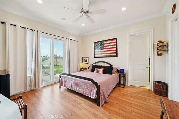This thoughtfully designed home boasts two primary suites on the main level, offering flexibility and luxury. An additional bedroom and bath are conveniently located near the kitchen. Above the garage, you'll find a private bedroom suite with a full bath and walk-in closet, accessible thru the house or via a separate entrance for ultimate privacy - perfect for guests, in-laws, or a private office space. Step out the back door to enjoy breathtaking sunsets under the expansive Alumawood patio cover. Entertain guests at the custom outdoor entertainment center, complete with a bar and liquor dispenser - the perfect spot to unwind after a long day. The recently painted exterior, complemented by updated landscaping and curbs, enhances the property's curb appeal, creating a welcoming first impression.