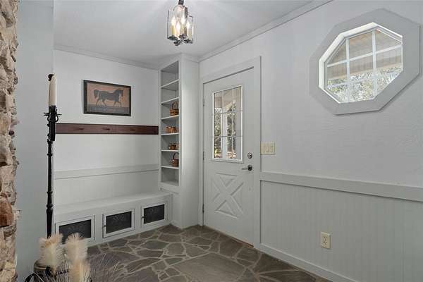 - Built-In Features, Ceiling Fans(s), Central Vaccum, Crown Molding, Eat-In Kitchen, Living Room/Dining Room Combo, Open Floorplan, Primary Bedroom Main Floor, Solid Wood Cabinets, Split Bedroom, Stone Counters, Thermostat, Walk-In Closet(s), Window Treatments