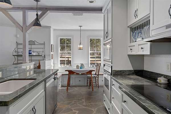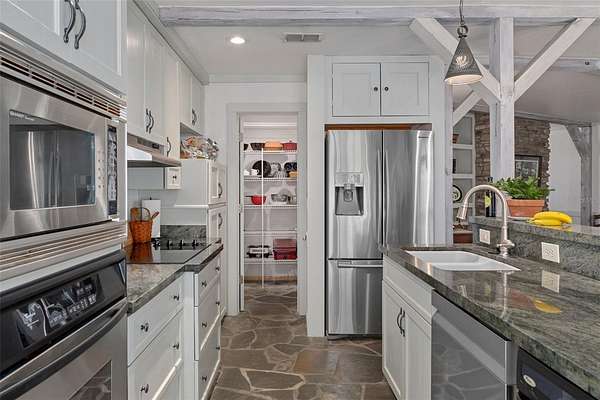Inside, you will love the character and craftsmanship showcased through antique fixtures, flagstone floors, wood-beamed vaulted ceilings, stone accents, barn doors, and two fireplaces for cozy ambiance. Practical upgrades include a central vacuum system, newer appliances, and a spacious walk-in pantry.