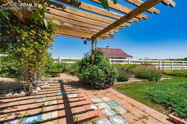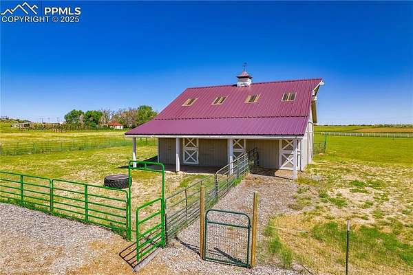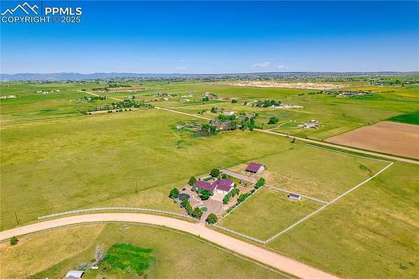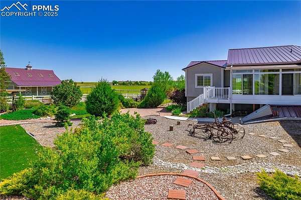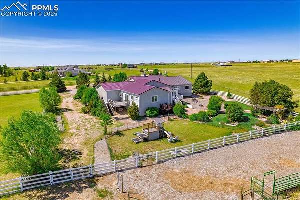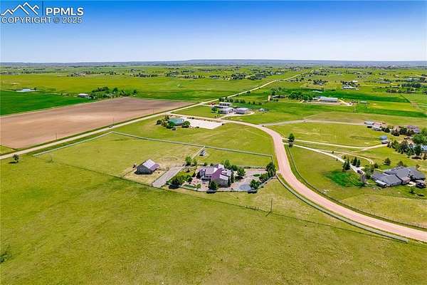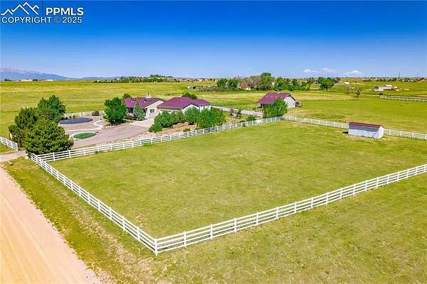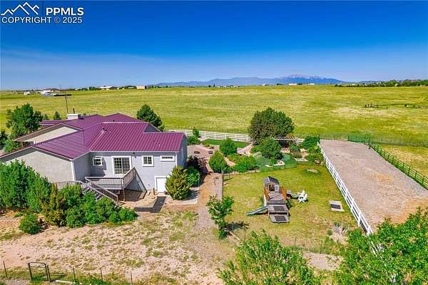 Multi-generational House - No HOA * 5.5 acres w/ separate apartment, and barn/workshop. Central AC. Close to Hwy 24, Woodmen, Meridian, Constitution, Peterson & Schriever 7 miles to new Falcon King Soopers. This custom home is a must see for all the family, whether you need a mother-in-law apt or a separate level for your adult children. It features a full 1 bedrm aptmt with kitchen, dining, laundry and living rooms with separate ramped entry & private deck. This ranch can accommodate everyone, including your horses, chickens & dogs. Another separate entry gives access to a basement apt with family rm, kitchenette & 2 bd/1 full bath. The main house features an XL island in a huge kitchen, w/ a pantry, cabinets galore & laundry hookups. Dine together in the 3 season sunroom w/ views of Pikes Peak or by the see-thru fireplace in the formal dining room. This ranch includes a lg master suite w/ 5 pc bath, 2 additional bedrms & another full bath. There is unbelievable storage throughout this property: 4 walk-in closets, 2 coat closets, pantry x2, a lg under apt walkable crawl space, 2 basement storage rooms, an oversized 3-car garage w/ shelves, an enclosed loafing shed and a 36x36 barn w/ loft & office. The property is completely fenced & x-fenced w/ 4-rail white vinyl, and divided into 3 gated pastures. The 2-story barn has electricity, water and a drive-thru feature. There are also fenced areas for vegetable gardening and a fenced play area close to the house for small children, pets or chickens. Mature landscaping abounds with trees, blooming bushes and flower beds galore, which are mulched for low maintenance and dripped by a domestic well. The brick patio and meandering pathways lead to many areas to entertain, play and enjoy the unobstructed views of Pikes Peak. Privacy and quiet are enhanced by the 40 acre ranch to the west and the 5 acre open church property to the east. So bring the whole family, horses and dogs to enjoy quiet country living at its best!