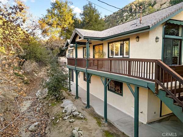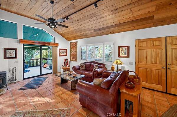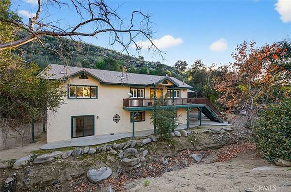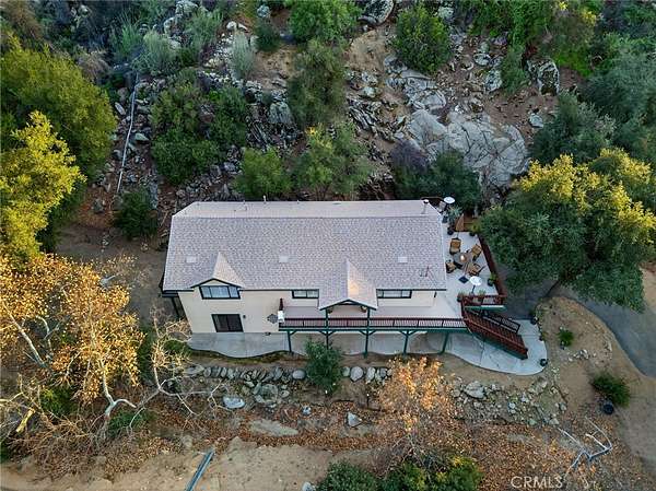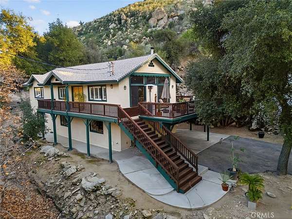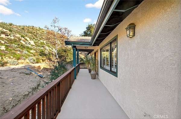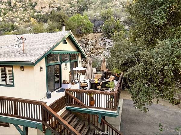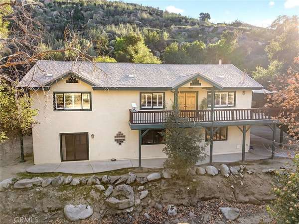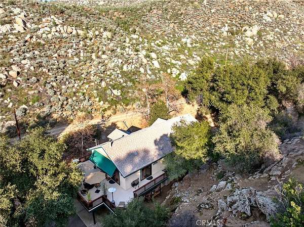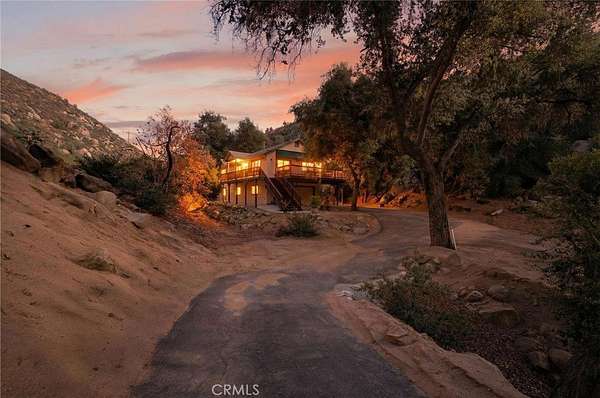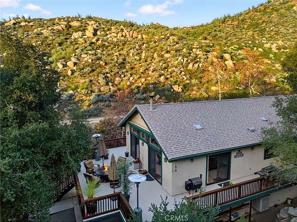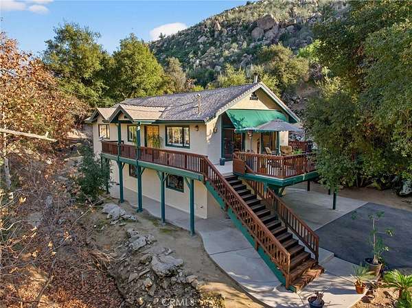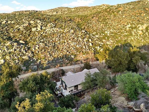 Welcome to your own secluded, picturesque retreat, where peaceful country living meets everyday convenience. Tucked behind a private gate shared by only nine homes, this custom-built residence is nestled on 5 serene acres in the hills of Hemet, offering privacy, natural beauty, and a true escape from the hustle of city life, yet still just minutes to shopping and dining, and a little over 20 miles to Temecula. This unique home is rich with natural rustic charm, featuring stunning cedar ceilings, beautiful tile flooring throughout, and a welcoming living room centered around a top-of-the-line wood-burning stove. The thoughtfully designed floor plan includes two spacious ensuite bedrooms, each with its own private bathroom, ideal for comfort, guests, or multigenerational living. The gourmet kitchen is both functional and inviting, highlighting tile countertops, gorgeous cabinetry, and modern stainless-steel appliances, including a double oven, perfect for entertaining or everyday living. Step outside to an 1,100 square foot wraparound deck, where you can relax and take in breathtaking views of mature trees, abundant wildlife, and a seasonal stream that enhances the property's tranquil setting. Below the home, an 884 square foot garage/workshop provides ample space for vehicles, hobbies, or storage. Zoned for horses, this property offers endless possibilities, whether you are seeking a private sanctuary, equestrian lifestyle, or a nature-filled retreat with room to roam. The property is adjacent to Simpson Wilderness Park which offers convenient hiking and mountain biking trails. A rare opportunity to enjoy quiet canyon living while staying connected to town conveniences.