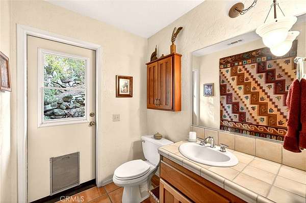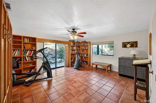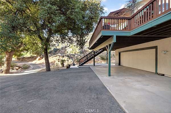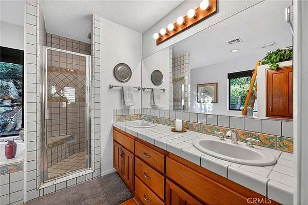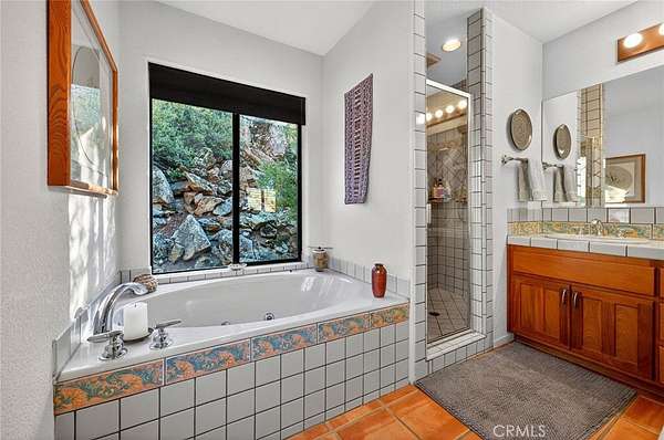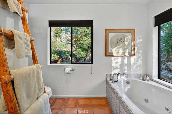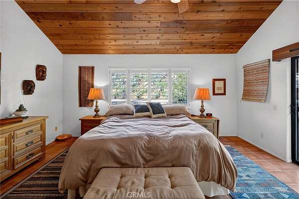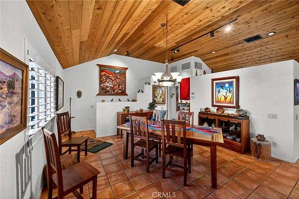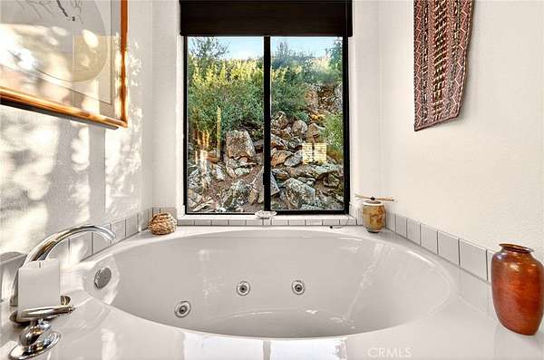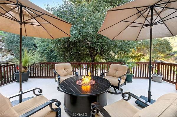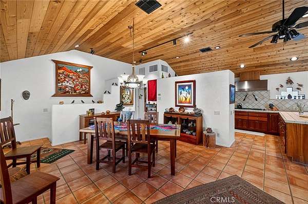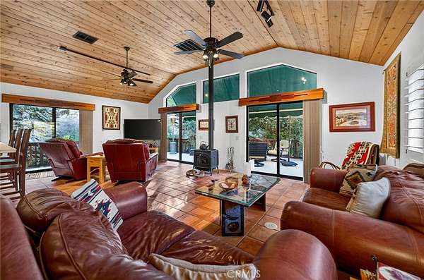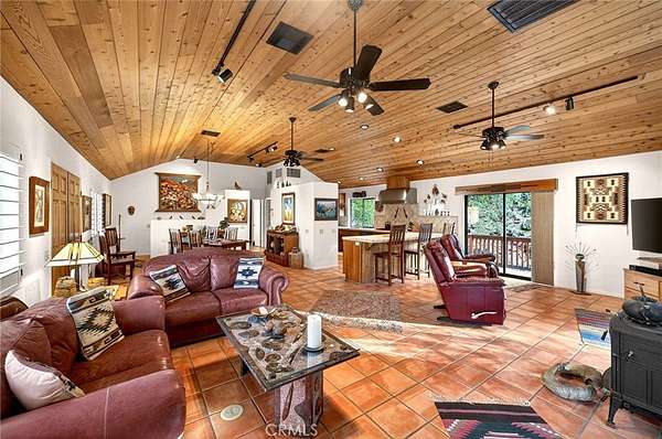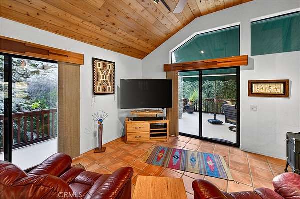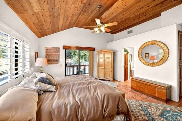 Welcome to your own secluded, picturesque retreat, where peaceful country living meets everyday convenience. Tucked behind a private gate shared by only nine homes, this custom-built residence is nestled on 5 serene acres in the hills of Hemet, offering privacy, natural beauty, and a true escape from the hustle of city life, yet still just minutes to shopping and dining, and a little over 20 miles to Temecula. This unique home is rich with natural rustic charm, featuring stunning cedar ceilings, beautiful tile flooring throughout, and a welcoming living room centered around a top-of-the-line wood-burning stove. The thoughtfully designed floor plan includes two spacious ensuite bedrooms, each with its own private bathroom, ideal for comfort, guests, or multigenerational living. The gourmet kitchen is both functional and inviting, highlighting tile countertops, gorgeous cabinetry, and modern stainless-steel appliances, including a double oven, perfect for entertaining or everyday living. Step outside to an 1,100 square foot wraparound deck, where you can relax and take in breathtaking views of mature trees, abundant wildlife, and a seasonal stream that enhances the property's tranquil setting. Below the home, an 884 square foot garage/workshop provides ample space for vehicles, hobbies, or storage. Zoned for horses, this property offers endless possibilities, whether you are seeking a private sanctuary, equestrian lifestyle, or a nature-filled retreat with room to roam. The property is adjacent to Simpson Wilderness Park which offers convenient hiking and mountain biking trails. A rare opportunity to enjoy quiet canyon living while staying connected to town conveniences.