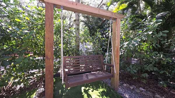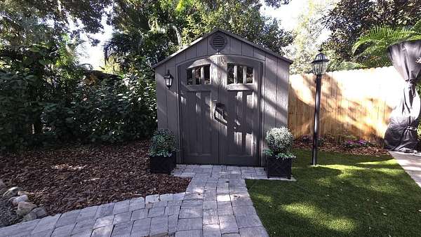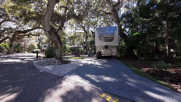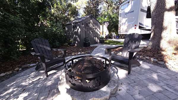 Property Features: Completely Remodeled: Enjoy a brand-new paver pad, artificial turf, landscape/mood lighting, professional lush landscaping, and integrated irrigation. The Vibe: Shaded by majestic Grand Oaks, this lot offers the perfect balance of Florida sun and cool afternoon shade. Outdoor Living Goals: Features a dedicated firepit zone with cozy seating, several seating areas, a full size shed, and a specialized grilling zone. Turn-Key & Furnished: Every piece of high-quality outdoor furniture and "S'mores Central" decor stays with the property. Prime Location: Tucked away for maximum privacy with perimeter hedges, yet just steps from the pool, laundry, and bathhouses.