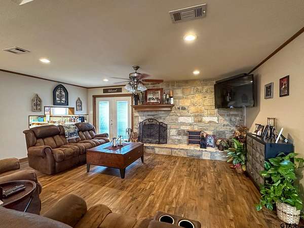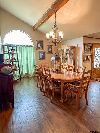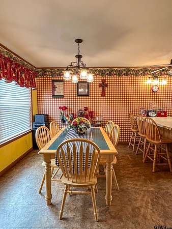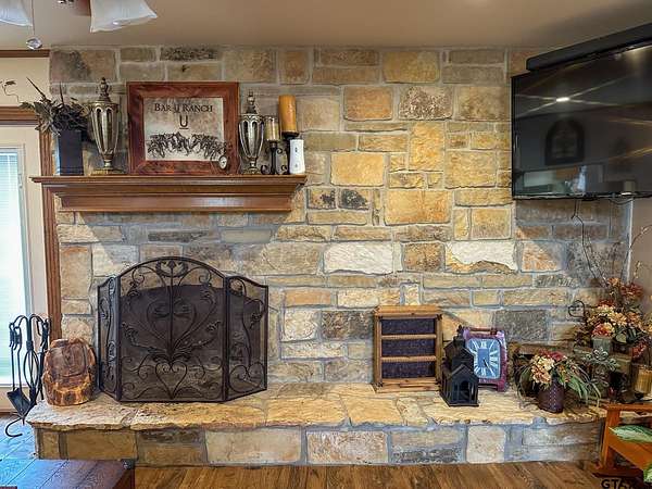 Discover the endless potential of this stunning 7.5-acre property! This charming 3-bedroom, 2.5-bath home offers spacious living and a versatile layout perfect for families, hobbyists, or entrepreneurs. Step inside to find a grand formal dining room that seamlessly flows into a warm and inviting living area featuring vaulted ceilings and a striking stone fireplace. The kitchen boasts a cozy breakfast room and breakfast bar, ideal for casual dining and entertaining. The large primary suite includes a tub/shower combo and generous space for relaxation, while the two additional bedrooms offer great size and ample storage. Outside, the property shines with a massive 3,800+ sq ft metal building currently used as a catering kitchen, office, and storage--ideal for business ventures, workshops, or future custom use. A second 1,000 sq ft barn adds even more functionality. Enjoy the serene, tree-shaded yard, complete with a circle drive for easy access and great curb appeal. Whether you're looking for a peaceful retreat, space to grow, or a place to launch your next project, this property has it all. Schedule your showing today and see how you can make it your home sweet home! House listed with different acreage options. House with 2.6 acres - $379,000 House with 12.53 acres - $615,000 No surveys have been completed, so amount of acreage can be adjusted to preference. See aerial for reference. All measurements are approximate.