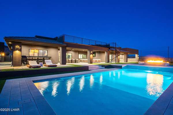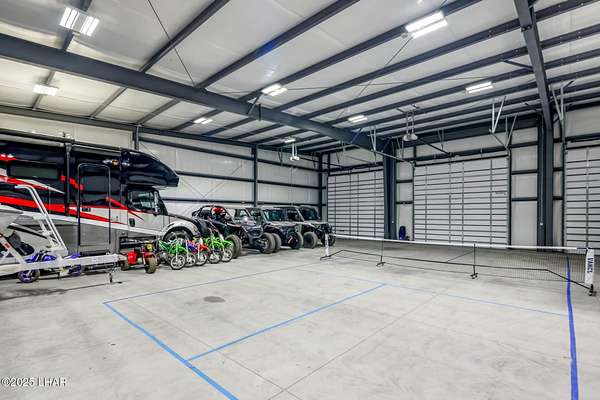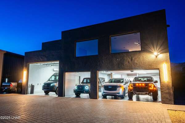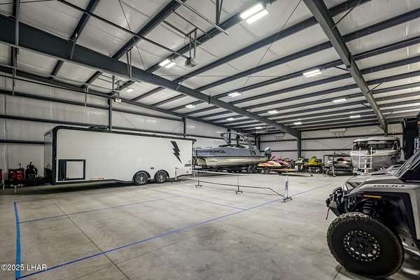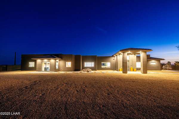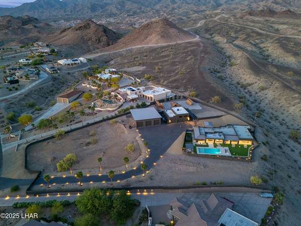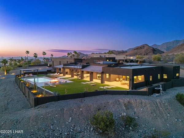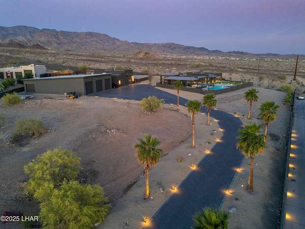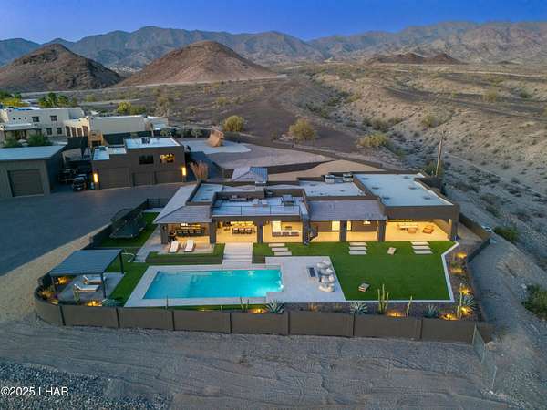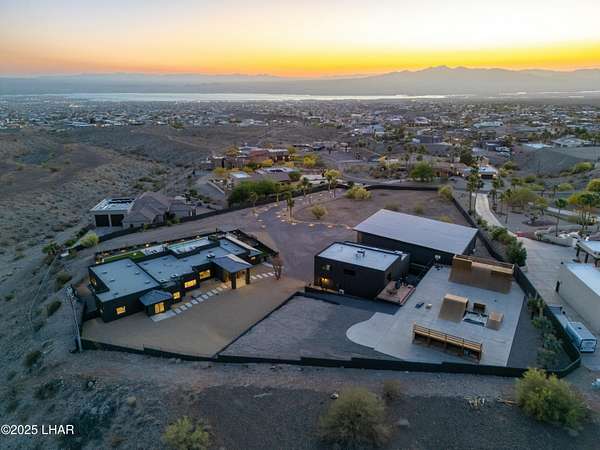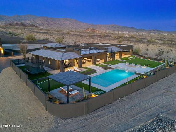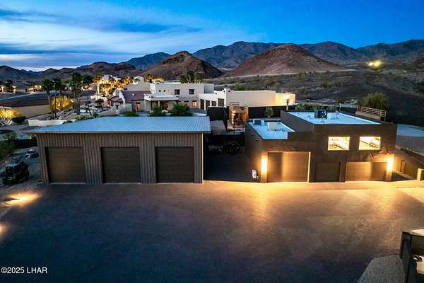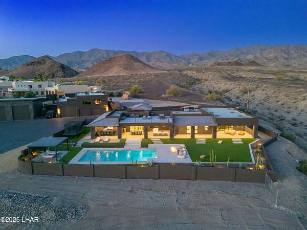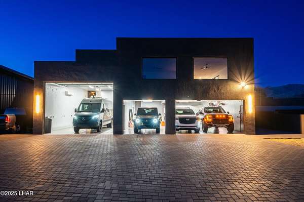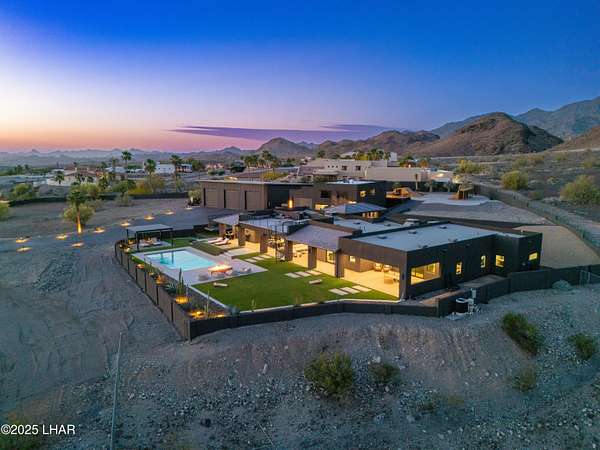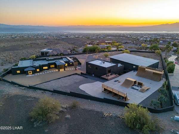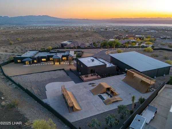 7,300 Square Foot Garage!!! Welcome to the first-of-its-kind desert estate on 3.4 acres in Lake Havasu's exclusive residential agricultural zone. This modern oasis blends upscale living with serenity and panoramic lake and mountain views. The 5,637 sq ft main home features three en-suite bedrooms plus an office, designed for comfort and privacy. A detached guest house includes a full kitchen, bedroom, living area, and stunning views. Outside, enjoy a resort-style pool, large covered patio, and full-blown skatepark that the owners could convert into 3 pickleball courts if desired. The property is fully walled for privacy and offers ample land for future development ideal for workshops, stables, or added guest quarters. Car and toy lovers will be thrilled by the remarkable 7,500+ sq ft garage with 14 tons of climate control and room for everything. Located in an extremely exclusive area, this is luxury desert living at its fines private, peaceful, and absolutely unforgettable. Don't miss this rare compound.