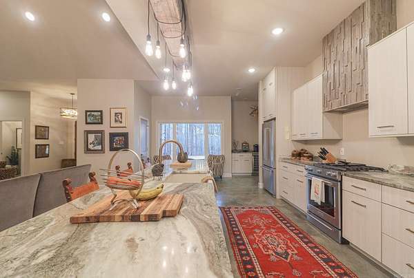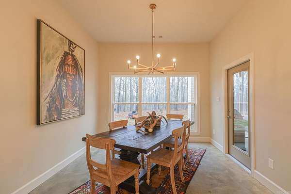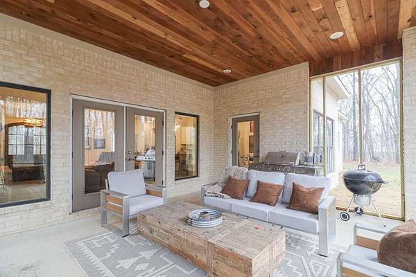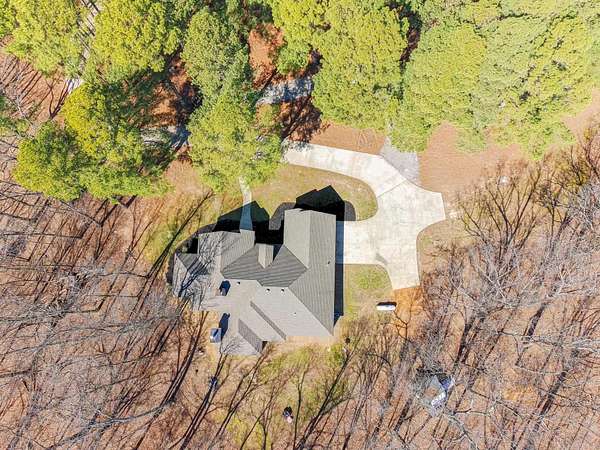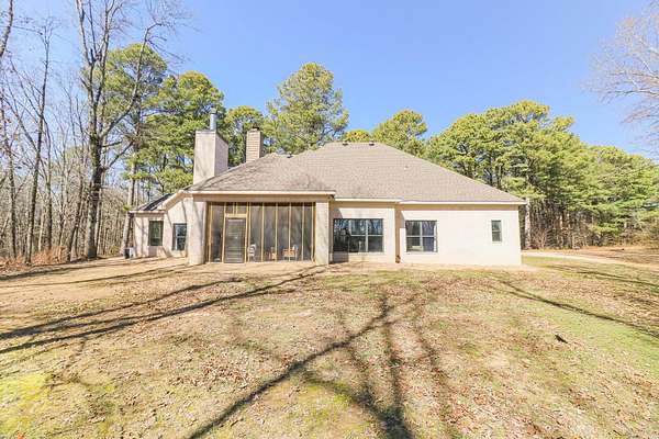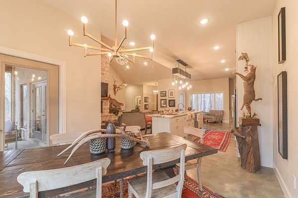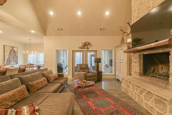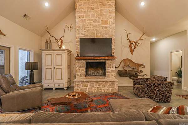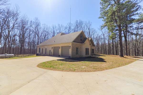 Welcome to 4223 County Road 318, a private retreat on 11.5 acres of mature timber where peaceful country living meets refined comfort. A long paved driveway winds through towering trees, creating a breathtaking entrance and setting the tone for the privacy and natural beauty beyond. This 2,619-square-foot brick and stone home offers timeless curb appeal and a thoughtfully designed open floor plan perfect for everyday living and entertaining. The spacious living room features vaulted ceilings and a stunning masonry fireplace, filling the space with warmth and natural light. The chef’s kitchen showcases granite countertops, a large island with seating for four, three ovens, a gas cooktop, and a built-in microwave—blending style and function for effortless hosting. The private primary suite offers serene views, a walk-in tile shower, and a soaking tub set beside a bay window. Two additional bedrooms share a bath with dual vanities, and one closet doubles as a secure steel-door safe room. A screened-in porch with a rock fireplace overlooks the wooded landscape, completing this tranquil lifestyle property.