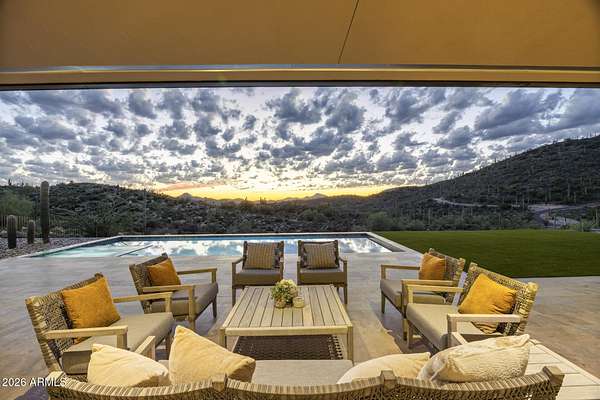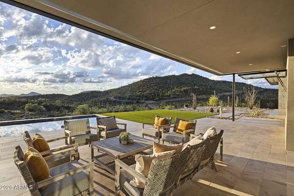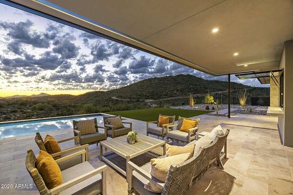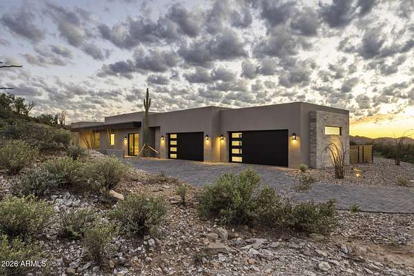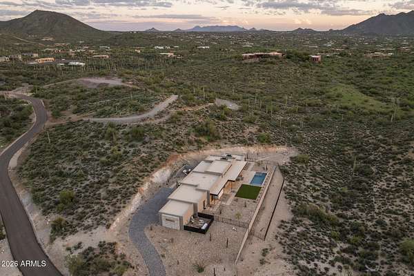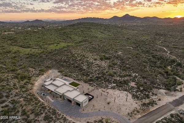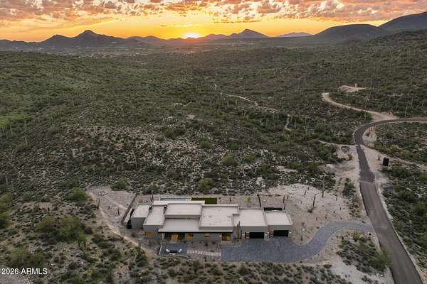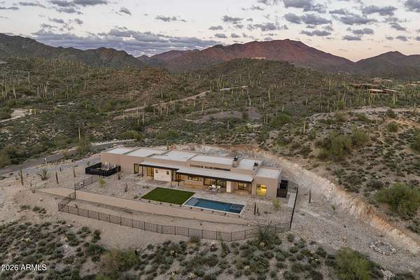 Move-in ready new construction masterpiece, the epitome of modern desert luxury in this exquisite single-story residence built by Full Circle Custom Homes, perfectly positioned just north of the heart of Cave Creek. Encompassing 3,580 square feet on a generous 4.5-acre lot, this thoughtfully designed home captures panoramic mountain vistas and the serene beauty of the Sonoran Desert. The open-concept layout seamlessly integrates elegance and everyday functionality, featuring 4 generously sized bedrooms, each boasting a private en-suite bathroom and expansive walk-in closet, plus a convenient powder room and a dedicated home office ideal for remote work or creative pursuits. The heart of the home is the gourmet chef's kitchen, flawlessly flowing into the expansive great room anchored by a dramatic stone fireplace that brings warmth and ambiance to gatherings year-round. Adjacent, a refined dining space showcases a built-in wine wall, perfect for entertaining family and friends in style. Retreat to the luxurious primary suite, a peaceful sanctuary offering captivating desert views, an oversized walk-in closet, and a spa-like bathroom complete with a walk-in glass shower. Premium details abound, from designer cabinetry and high-end finishes throughout to the oversized four-car garage for ultimate convenience. Step outside to your private resort-style backyard oasis: a sparkling pool with sunken spa, surrounded by breathtaking panoramic sunset views and the tranquil sounds of nature. For added versatility, an optional guest casita and RV Garage can be incorporated to accommodate visitors or extended family. Ideally located less than 5 minutes north of vibrant downtown Cave Creek, with its charming shops, galleries, restaurants, and Western flair, and only 30 minutes from the upscale dining, shopping, and cultural attractions of North Scottsdale. Experience this exceptional property firsthand with a 3D virtual tour. Drone video of the development available upon request. This is more than a home, it's a refined desert lifestyle waiting to welcome you.