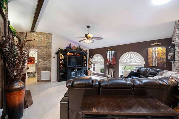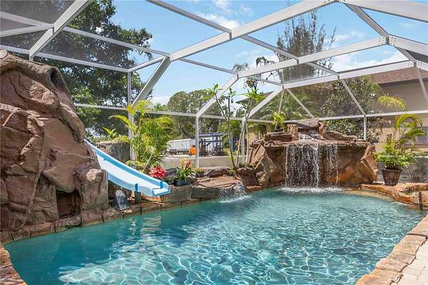 The main home offers over 2,600 sq ft of updated living space, featuring 3 bedrooms, 2 full bathrooms, rich Chicago brick accents, granite countertops, plantation shutters, and warm, timeless finishes. Step outside to a resort-style pool with rock waterfalls, a water slide, and a large patio space perfect for entertaining or relaxing under the Florida sun.