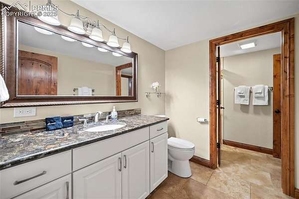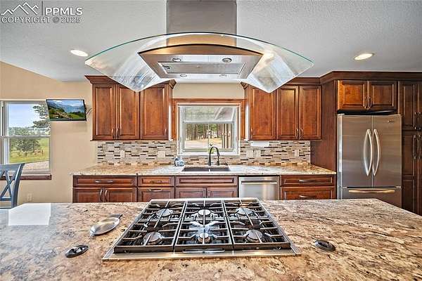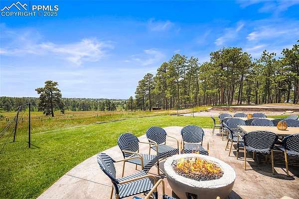 Tucked away on nearly 10 pristine acres of pine covered serenity, this one of a kind 6003 sq ft estate offers ultimate privacy, luxury, and equestrian living- just 20 minutes from shopping, dining, and urban conveniences. Designed for both relaxation and entertainment the home features a gourmet kitchen, with top of the line appliances, expansive granite counters, and custom cabinetry. The open-concept living areas are bathed in natural light and boast breathtaking views of Pikes Peak, visible from multiple rooms and outdoor spaces. Indulge in year-round wellness with your own hot tub and a 44ft heated indoor lap pool, nestled in a vaulted atrium-style enclosure that brings the outdoors in. Whether you're hosting guests or enjoying a quiet morning swim, the ambiance is unmatched. Outside, the property is zoned for horses. The "barn" (11,976 SF) has a 78' by 58' indoor riding arena, 8 stables with heat, 3-bedroom caretaker residence, tack rooms, office space, feed room, and bathroom. There is also nearly 2,000 SF of covered outdoor storage. The barn has not been used by the current owner but is ready to create new value for a buyer. The grounds are fully usable and ideal for those seeking the tranquility of country life without sacrificing proximity to excellent D-38 schools and city amenities. This is more than a home-it's a retreat, a lifestyle, and a rare opportunity to own one of the area's most private and versatile properties.Please do not disturb guests by driving on property as this is an active VRBO.