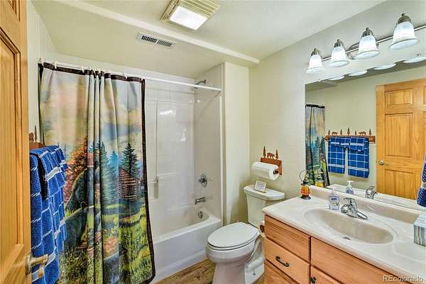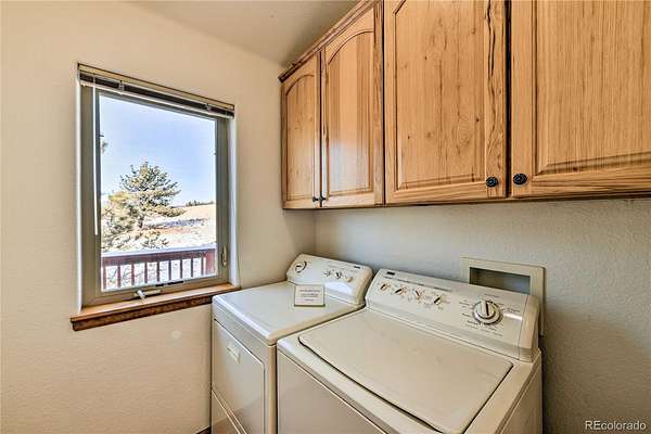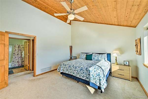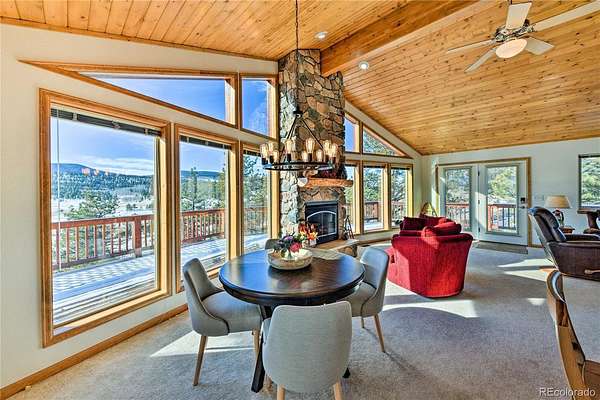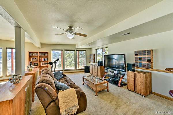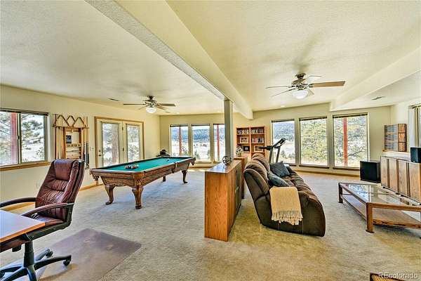 Incredible cedar sided mountain retreat on 3 acres located in Ranch of the Rockies! You will take notice of the custom features in the home like hickory hardwood cabinets, floor to ceiling propane stone fireplace, and large wrap around deck with views galore. The tongue and groove pine ceilings are very charming and the abundance of windows in the living room and family room are spectacular. The primary bedroom and en-suite bath are oversized and more than comfortable. In the finished walkout basement you will love the pellet stove, full bathroom, and the pool table for entertainment. The walkout patio is wired with 220 for having a hot tub and the attached oversized two car garage/workshop is a major bonus. A 10X12 and 12X16 storage shed has plenty of space for all of your toys. Other nice features of this home include water well rights for irrigation and the ability to have horses if desired. A radon mitigation system has been installed for peace of mind. Ranch of the Rockies HOA includes central trash service, dog park, pavilion, and a stocked fishing reservoir for all property owners and guests. Colorado Springs and Denver are a short drive away. National forest access is close by. You will enjoy hiking, biking, fishing, and exploring all within minutes of home. This is a very special destination in the heart of the Colorado Rockies. This property is beautiful. Come check it out.