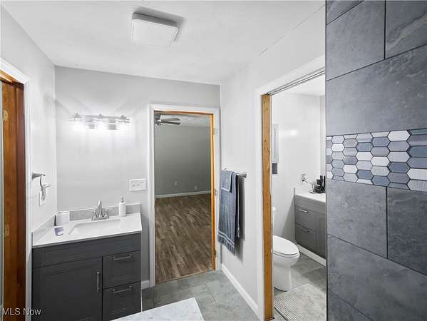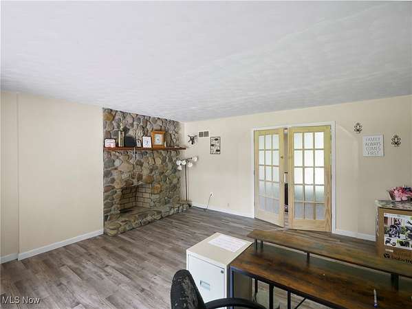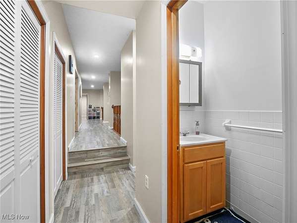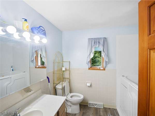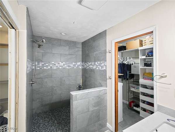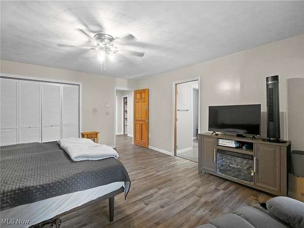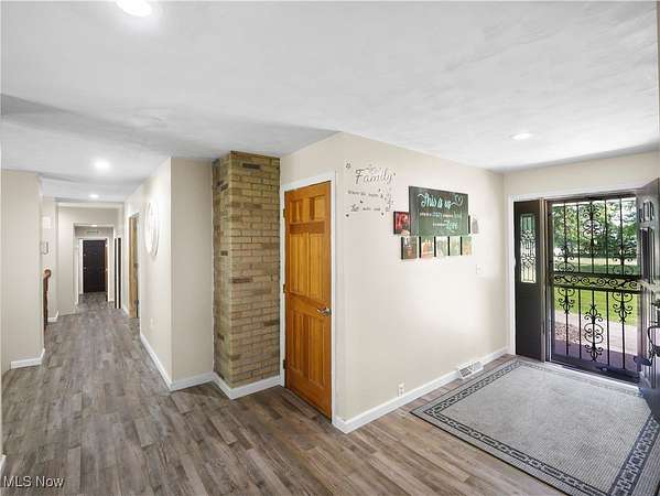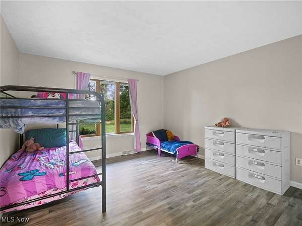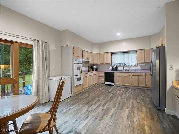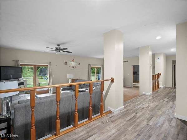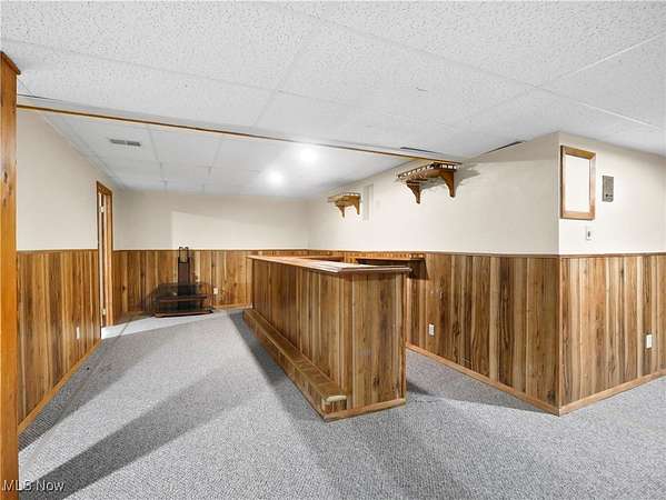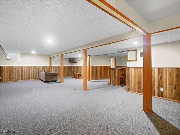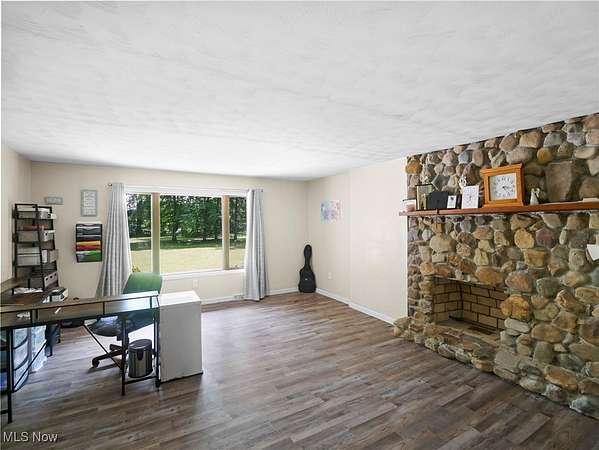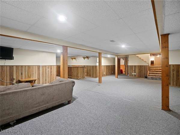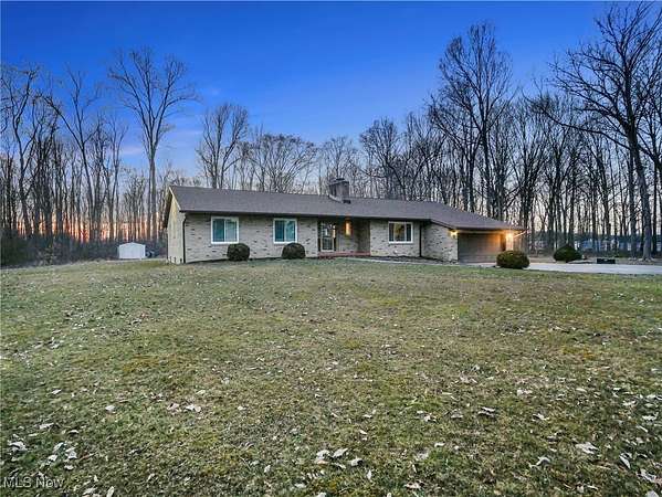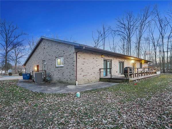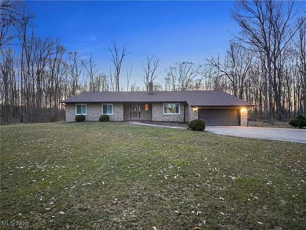 Nestled on a sprawling 5.3-acre lot in Lordstown set back from the road, this expansive brick ranch offers a serene escape surrounded by lush woods. Enter through the inviting glass-front door into a spacious open-plan layout, featuring stylish new vinyl plank flooring that extends throughout the main hall. The living room, distinct with its sunken design, boasts a cobblestone fireplace and an impressive mantle, creating a cozy yet elegant atmosphere. This room flows seamlessly into the large kitchen, featuring new vinyl plank flooring and sliding doors that open to a tranquil rear deck. Conveniently located on the main floor are a half bath, laundry facilities, and garage access. The sleeping quarters comprise three inviting bedrooms, each served by a lavish full bathroom with a disability-friendly shower. The master suite is a true retreat, boasting an expansive layout, a newly updated en-suite bathroom with a built-in shower bench and water closet, and a walk-in closet. The lower level adds substantial living space with a large family room, equipped with a full bar and adjacent bonus room. Plumbing is in place for an additional full bathroom, enhancing the potential of this versatile area. Recent updates include a new furnace (August 2023), windows (2025), hot water tank (August 2023), A/C (August 2023), roof (August 2023), and sump pump (August 2023). Additionally, the property has transitioned from a septic system to public sewer (September 2022), Brand new carpet (2025). Seller offering APHW 1-year Home warranty.