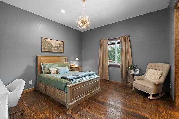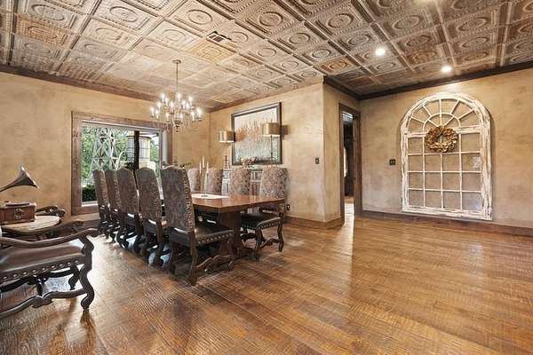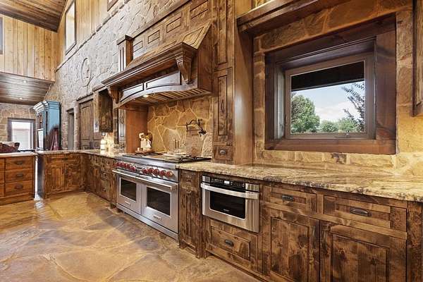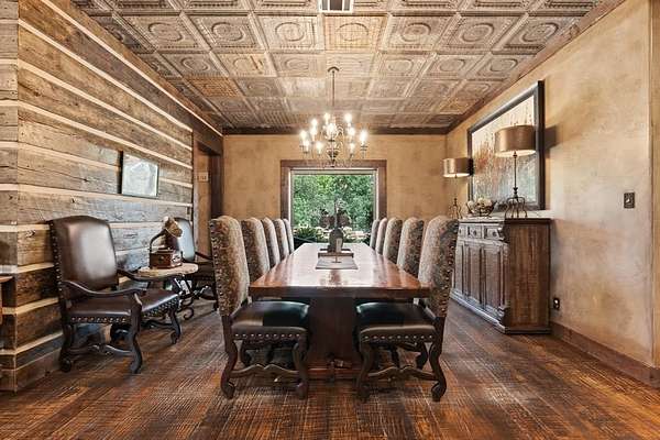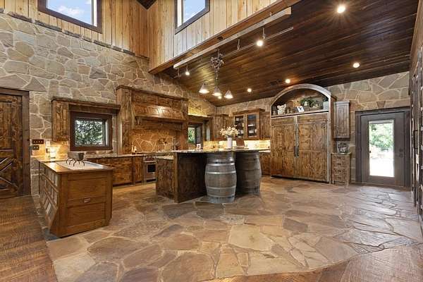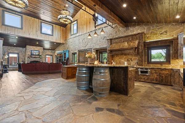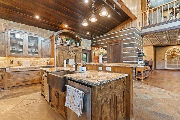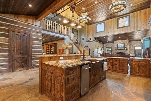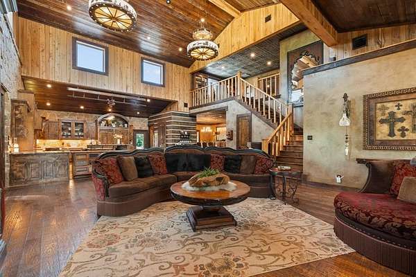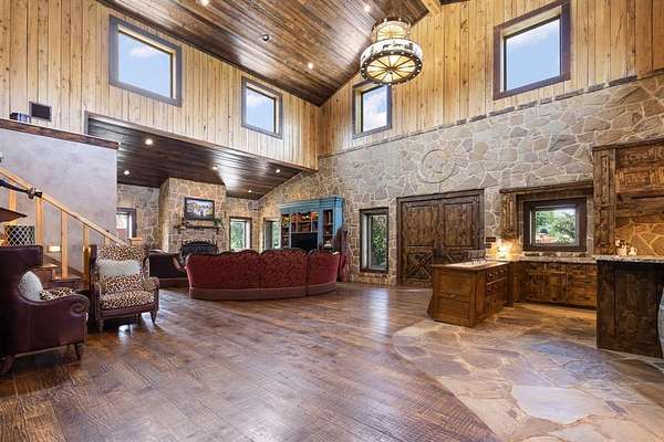 Inside, the home is a showcase of craftsmanship and design, boasting soaring wood-paneled ceilings, rich hardwood floors, and hand-selected rustic finishes throughout. The open-concept great room with a dramatic stone fireplace flows seamlessly into the gourmet kitchen, equipped with high-end appliances, custom cabinetry, and a massive granite island perfect for gatherings plus a large walk in pantry and separate formal dining area .