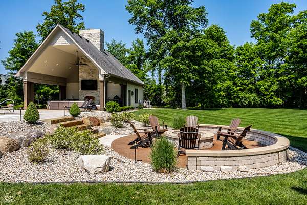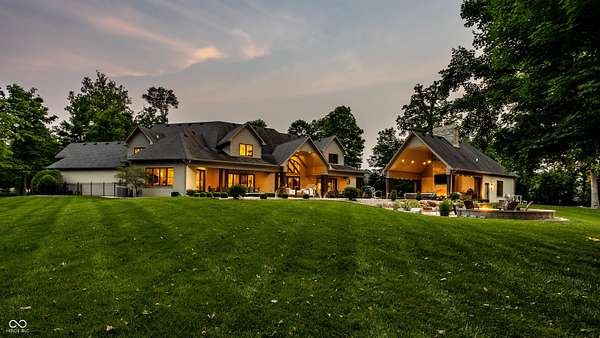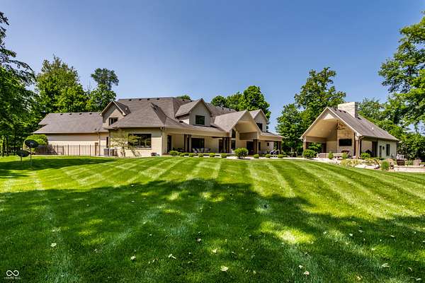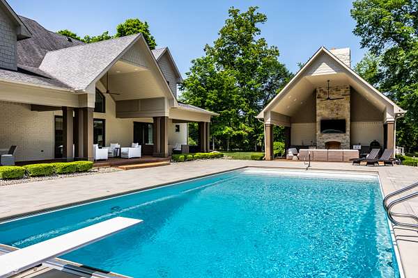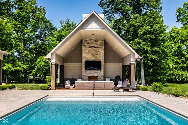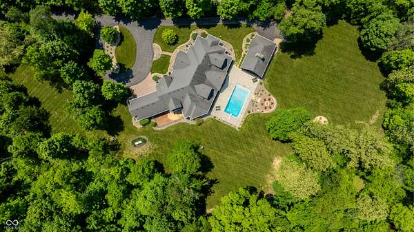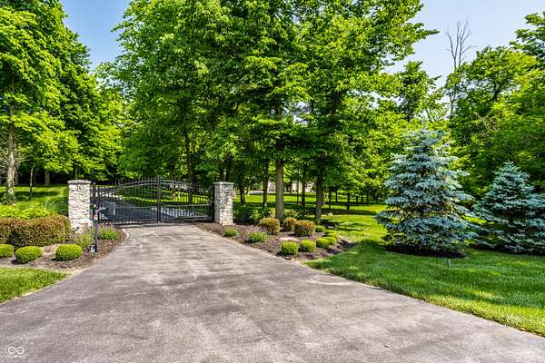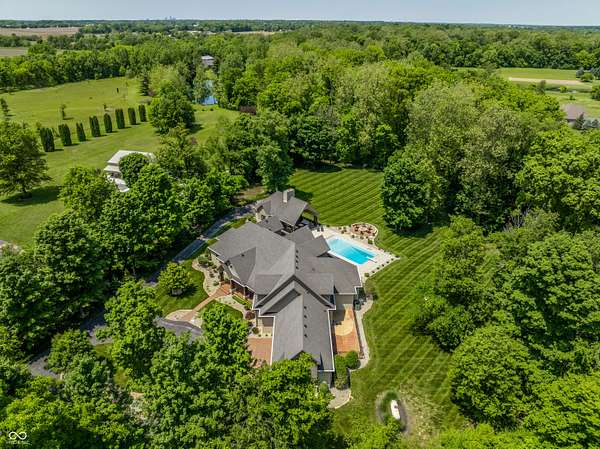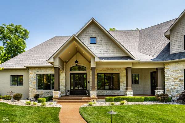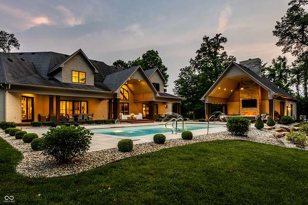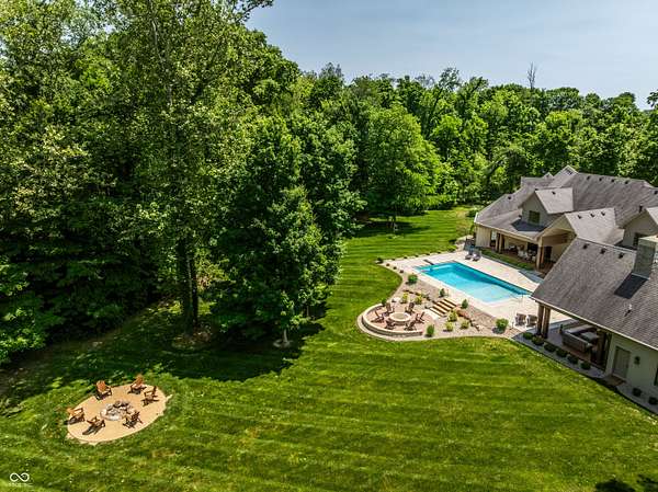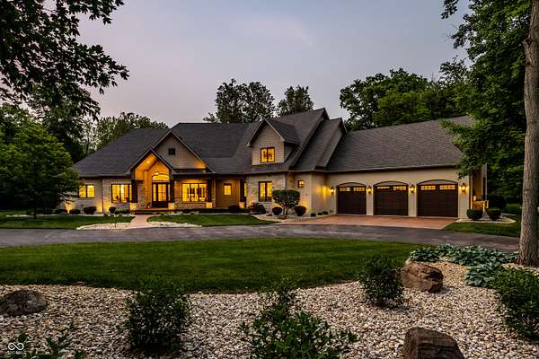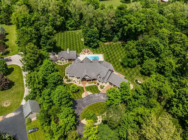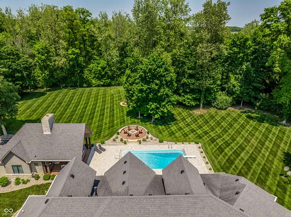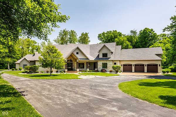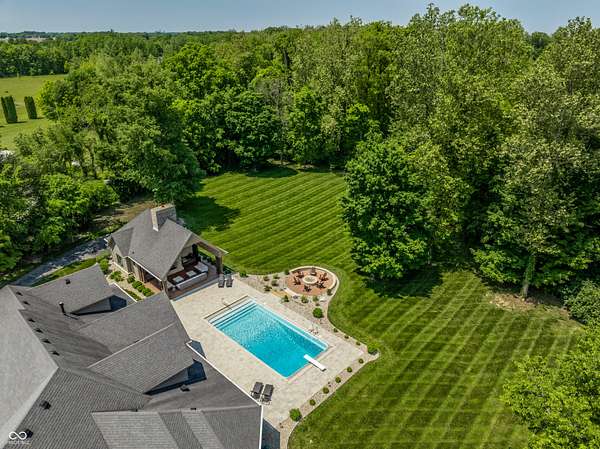 Nestled behind a private stone entry gate on 5 wooded, meticulously landscaped acres, this custom estate built by Mike Duke Custom Builder in 2016 offers refined living with every detail thoughtfully designed. Featuring 4 bedrooms, 4.5 baths, and over 5,700 square feet of high-end finishes, this home blends timeless craftsmanship with modern comfort. The main level showcases an open-concept layout with 10' ceilings and 8' doors, a soaring beamed cathedral ceiling in the great room and seamless access to a full-length covered porch from the kitchen, sunroom, and primary suite. The gourmet kitchen is a chef's dream-Thermador appliances, a 10-foot island with seating for six, granite counters, butler's pantry with private catering entry, and a temperature-controlled 750-bottle wine cellar. The main floor primary suite offers a spa-inspired retreat with a 2023-renovated En-suite bath, walk-in shower, soaking tub, and a spacious closet with its own washer/dryer. A separate main floor in-law suite includes a private bath, walk-in closet, and rough-ins for a kitchenette. Upstairs you'll find two additional en-suite bedrooms, a media/rec room, and office. A finished workout room with walkout access to a fenced patio, formal dining room, and an executive office with custom cabinetry round out the main living spaces. Step outside to a true backyard oasis: a 20x40 Gunite pool with diving board, automatic cover, and paver surround; hot tub; outdoor pavilion with stone fireplace, kitchen, gas grill, sink, refrigerator, and Green Egg; plus gas and wood-burning fire pits. A detached 2-car garage with half bath, epoxy floors, adds even more flexibility. Additional features include: 3-car attached garage with dog wash, slat wall, and storage. Anderson 400 series windows and sliders. Generator, dehumidifier, reverse osmosis system, Invisible fence, Control4 audio system, alarm and video surveillance. 3 HVAC units, and much more.