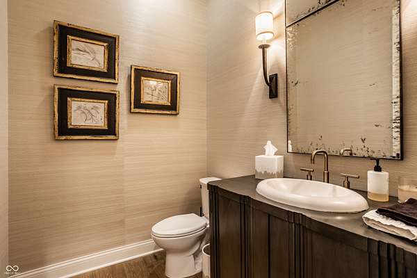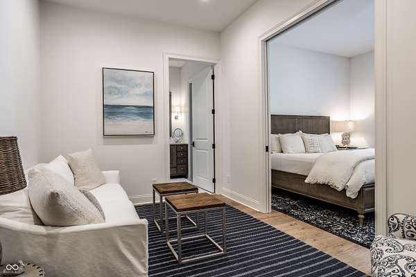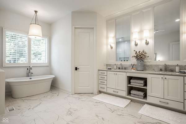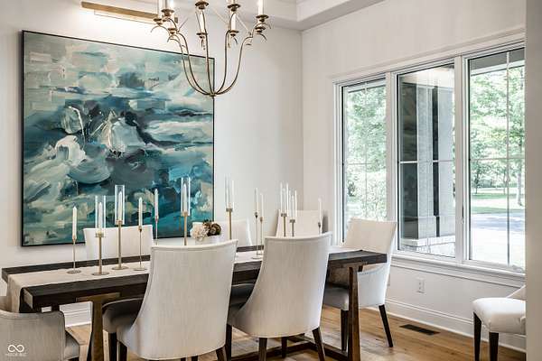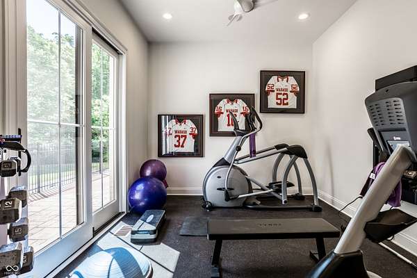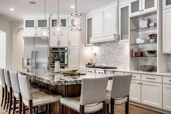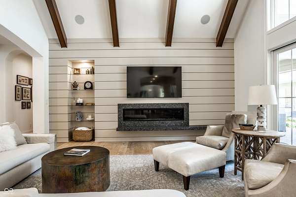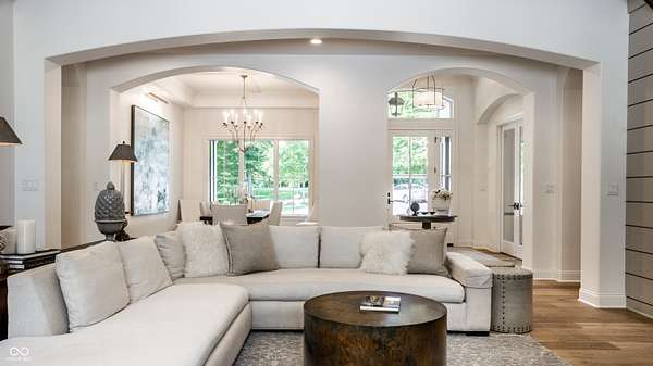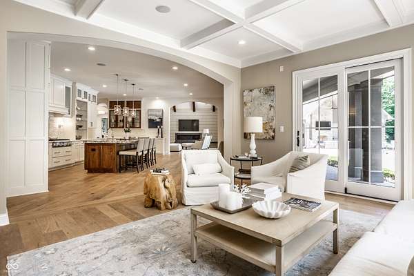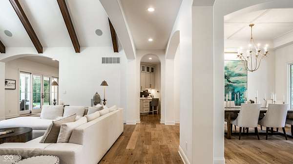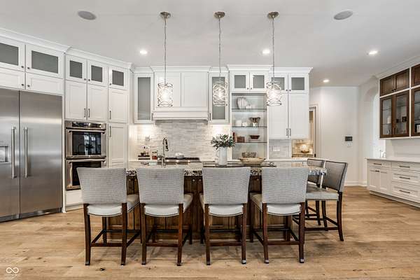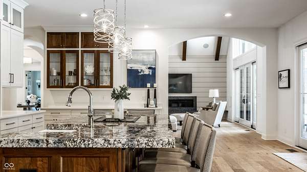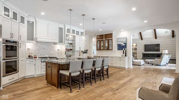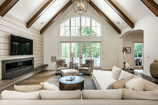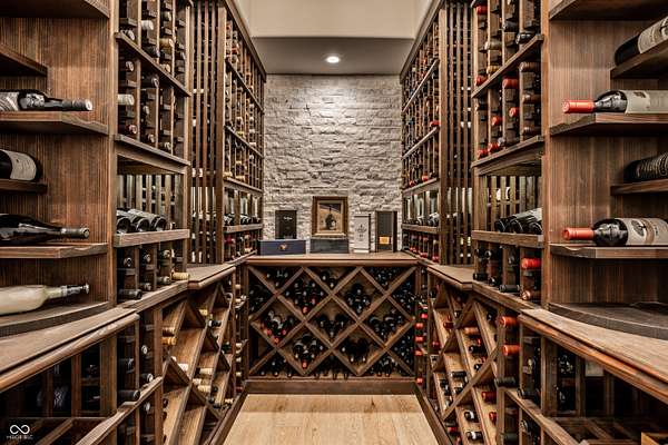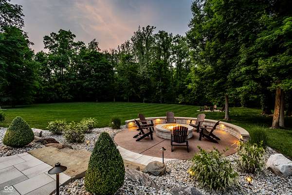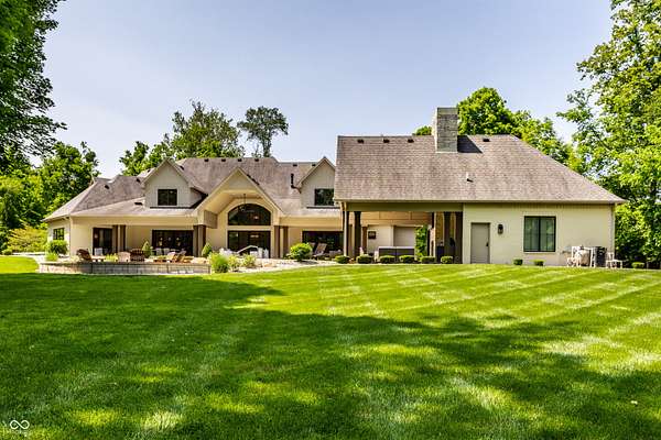 Nestled behind a private stone entry gate on 5 wooded, meticulously landscaped acres, this custom estate built by Mike Duke Custom Builder in 2016 offers refined living with every detail thoughtfully designed. Featuring 4 bedrooms, 4.5 baths, and over 5,700 square feet of high-end finishes, this home blends timeless craftsmanship with modern comfort. The main level showcases an open-concept layout with 10' ceilings and 8' doors, a soaring beamed cathedral ceiling in the great room and seamless access to a full-length covered porch from the kitchen, sunroom, and primary suite. The gourmet kitchen is a chef's dream-Thermador appliances, a 10-foot island with seating for six, granite counters, butler's pantry with private catering entry, and a temperature-controlled 750-bottle wine cellar. The main floor primary suite offers a spa-inspired retreat with a 2023-renovated En-suite bath, walk-in shower, soaking tub, and a spacious closet with its own washer/dryer. A separate main floor in-law suite includes a private bath, walk-in closet, and rough-ins for a kitchenette. Upstairs you'll find two additional en-suite bedrooms, a media/rec room, and office. A finished workout room with walkout access to a fenced patio, formal dining room, and an executive office with custom cabinetry round out the main living spaces. Step outside to a true backyard oasis: a 20x40 Gunite pool with diving board, automatic cover, and paver surround; hot tub; outdoor pavilion with stone fireplace, kitchen, gas grill, sink, refrigerator, and Green Egg; plus gas and wood-burning fire pits. A detached 2-car garage with half bath, epoxy floors, adds even more flexibility. Additional features include: 3-car attached garage with dog wash, slat wall, and storage. Anderson 400 series windows and sliders. Generator, dehumidifier, reverse osmosis system, Invisible fence, Control4 audio system, alarm and video surveillance. 3 HVAC units, and much more.