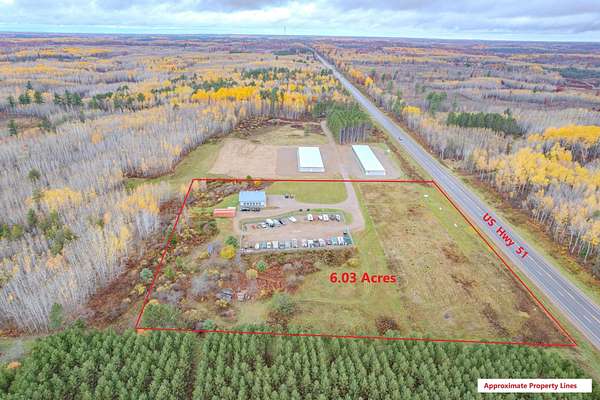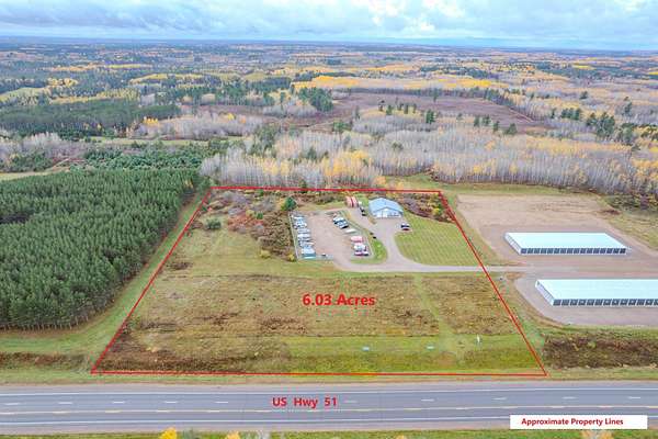 Excellent US Hwy 51 high visibility Business B-2 Property conveniently located between Tomahawk, Rhinelander and Minocqua. Spacious 6.03 acres with 515' of Hwy 51 frontage features a 48'x48' metal pole building built in 2009. Fenced in secure boat, vehicle, equipment, trailer parking area for good ancillary income potential. Interior offers a reception and showroom area, 2 offices spaces, break room with kitchen, 1 full bath, utility/laundry room, and a 32'x48' workshop/garage space. Soundproof insulation between offices and workspace. Concrete foundation is 5" deep with mesh and rebar reinforced with epoxy. Insulated OH doors, ventilation system, humidifier, LP furnace in shop, dual stage furnace, security and surveillance systems. Extra storage space above office is heavy equipment approved. Adjacent to snowmobile/UTV trail. Acreage provides room for expansion. Business B-2 zoning will accommodate most all business uses.