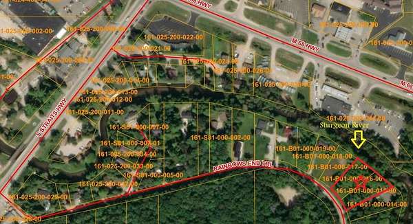 Straits Highway South through Indian River. Turn left on Rainbows End Trail (just south of Reeds on the River cabins), turn left. Lots on the left, look for signs.