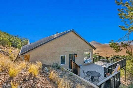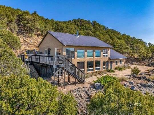 Dreaming of owning a property that offers unparalleled views of the majestic Sangre de Cristo mountains? Look no further than this unique, artistic home! The two-bedroom, two-bath passive solar home is a true architectural gem, featuring a two-story design partially integrated into the earth. The expansive open living room, facing SW, boasts floor-to-ceiling windows, flooding the space with natural light and offering panoramic views of the surrounding landscape. The lower living area features a wood-burning fireplace, while the primary bedroom has a propane fireplace, perfect for chilly nights. The custom kitchen showcases exquisite granite touches and Viking range, creating a perfect blend of style and functionality. With ample storage space throughout, including cabinets and cupboards in the laundry room and a utility area, as well as a two-car attached garage and an additional two-car detached garage, this home is designed to cater to your every need. Enjoy the second-story deck and be prepared to amaze your guests with the breathtaking vistas of the Sangres!