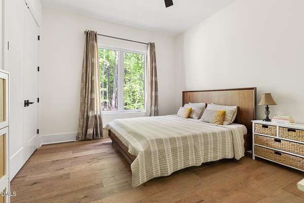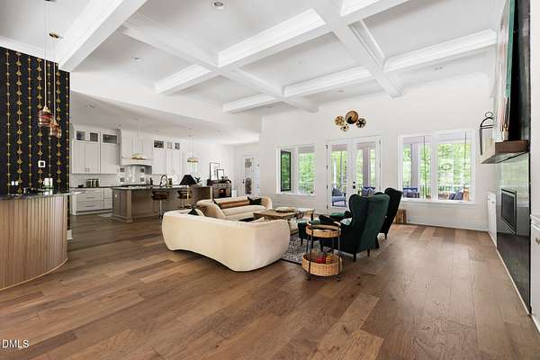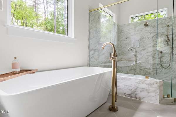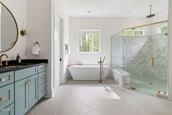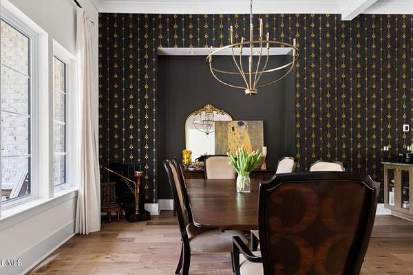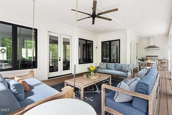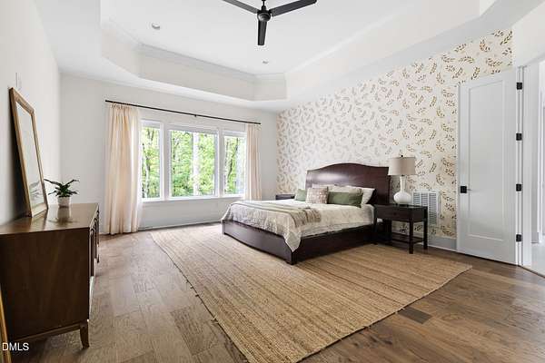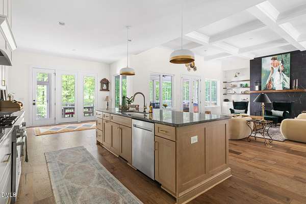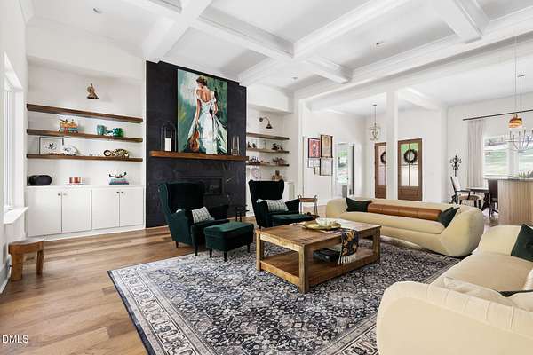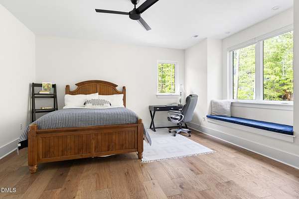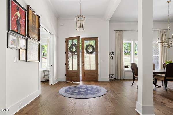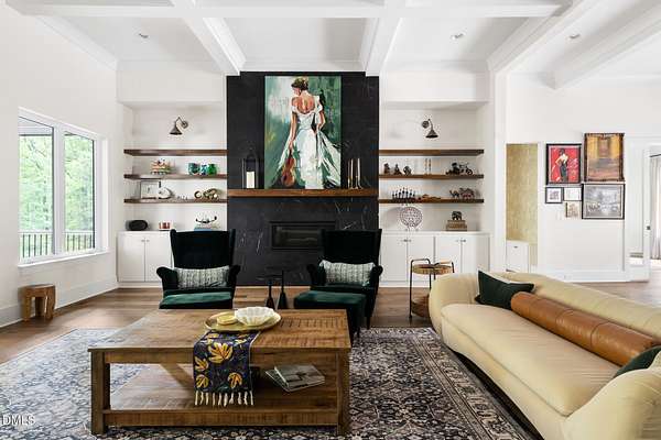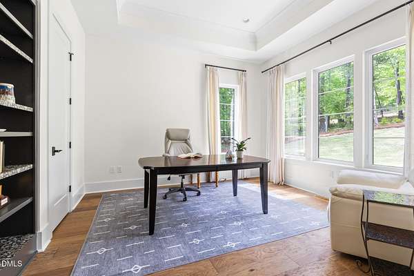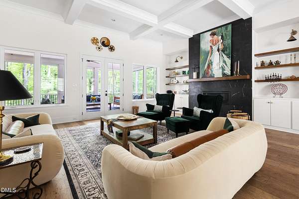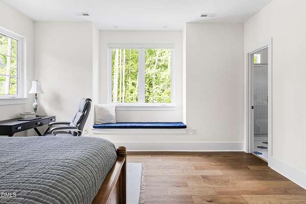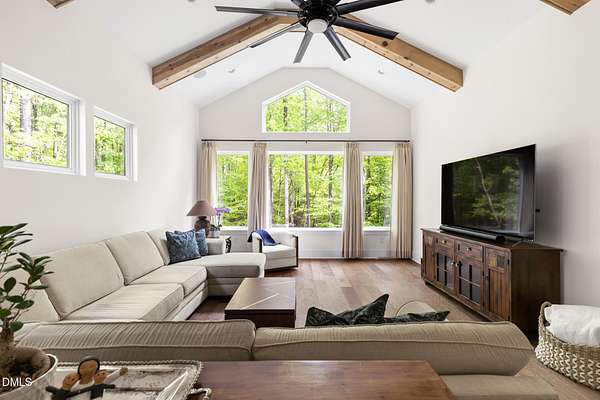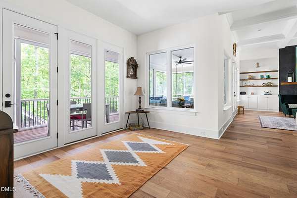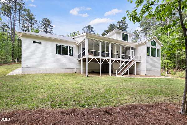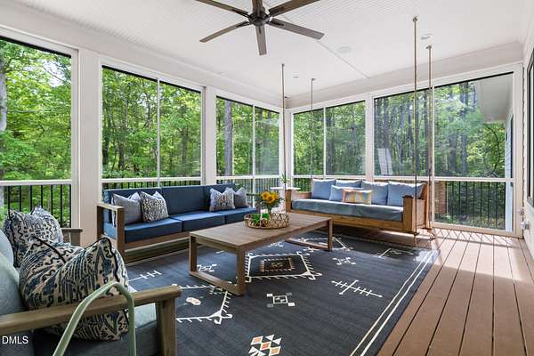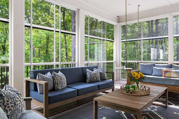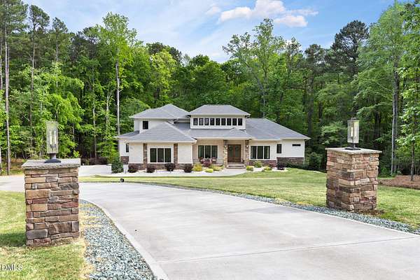 Turn-key, better than new, custom-built home nestled on 6.5 beautifully landscaped acres in Chapel Hill's Windfall Neighborhood. Built in 2022 with meticulous attention to detail, enjoy a gracious floor plan that features a main floor primary suite, main floor guest bedroom with en-suite, and main floor office...a winning and rare combo. The open-concept layout showcases an impressive family room with 12-foot coffered ceilings, built-in bookcases, and a linear gas fireplace, perfect for gatherings. The gourmet kitchen equipped with high-end Dacor appliances features a large center island offering counter seating, ample cabinetry with walk-in pantry for ease and convenience, and marble backsplash. Adjacent is a bright breakfast area, surrounded by windows offering serene views of the private backyard. Showstopping screened porch with built-in Coyote grill and hood vent, Phantom screens, and Eze-breeze for true year-round enjoyment. Formal dining space and adjacent dry bar beckons entertaining. Cozy up in an additional gathering space on the main level featuring a vaulted ceiling and expansive windows providing canopy views of the lush landscape. The main floor primary suite is a true retreat with tall ceilings and bountiful light. Enjoy a luxurious ensuite bath with double vanities, soaking tub, walk-in shower, and deluxe walk-in closet with custom built-ins. Two additional bedrooms with private bathrooms on the second level. Epoxy garage equipped with EV charger, providing plenty of space for vehicles & more. A mudroom with custom built-ins, a laundry room of your dreams with it's ample size and storage. Sealed crawl space offers peace of mind. Easy to access walk-in attic storage. Zoned for Seaforth High School. Located less than two miles from Jordan Lake's scenic trails and water sport activities, featuring 150 miles of magnificent shoreline. Come see for yourself, embrace the lifestyle you've dreamed of - you won't want to leave!