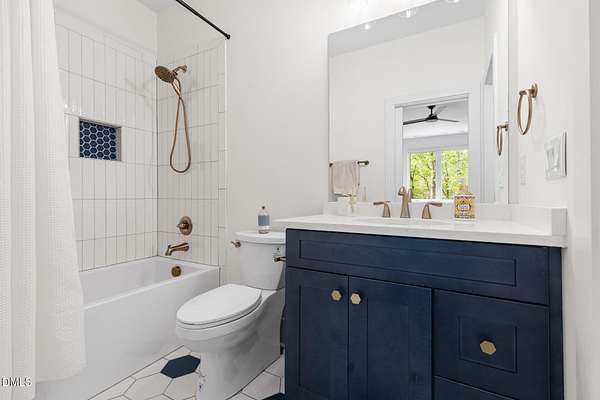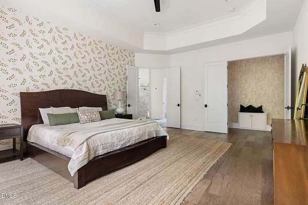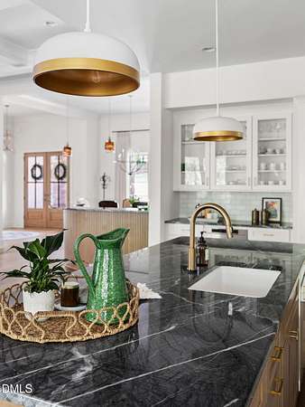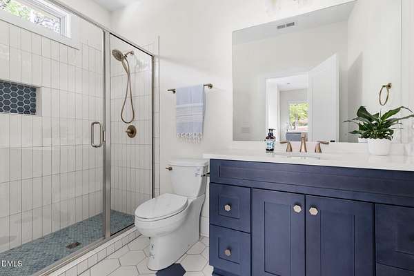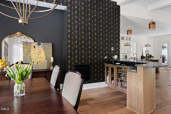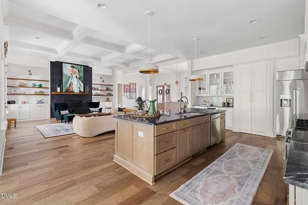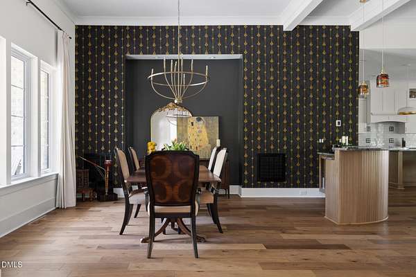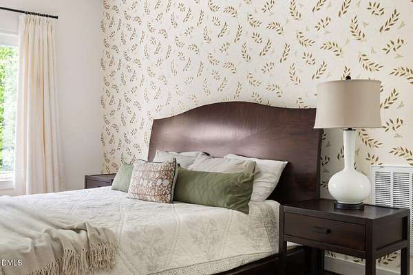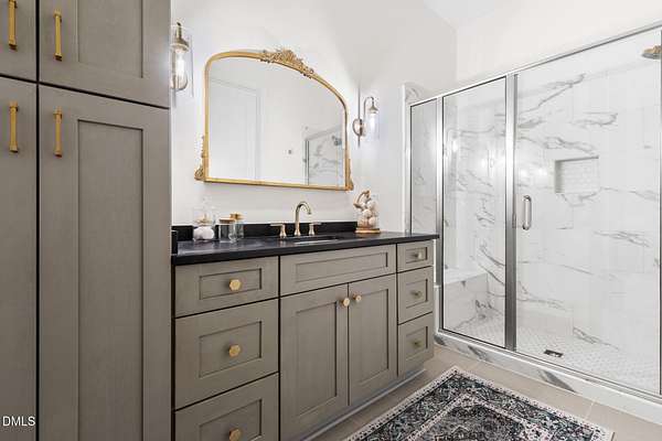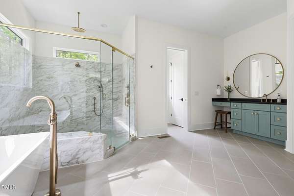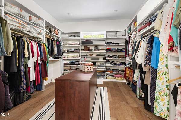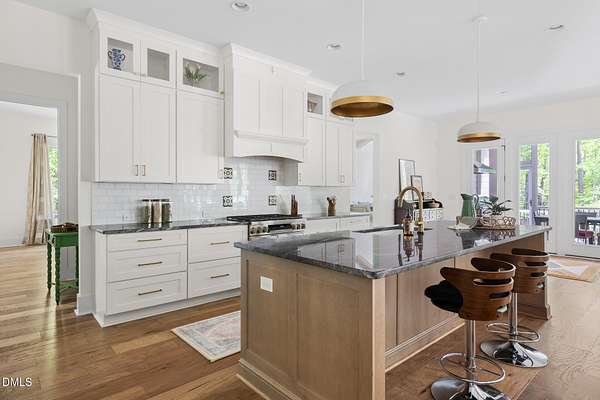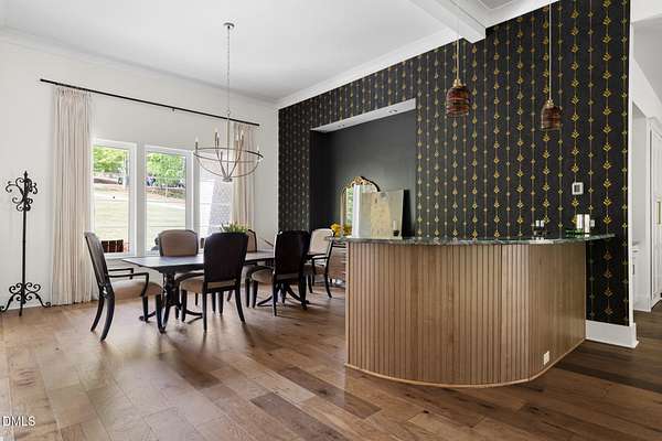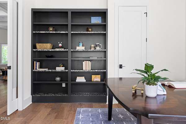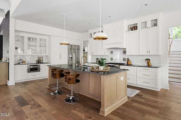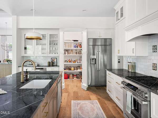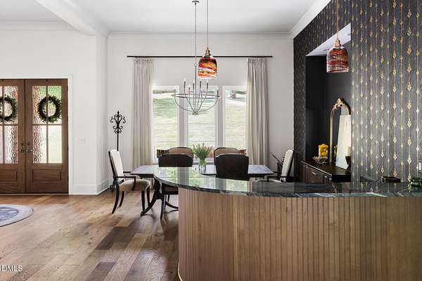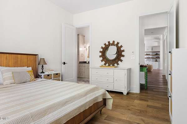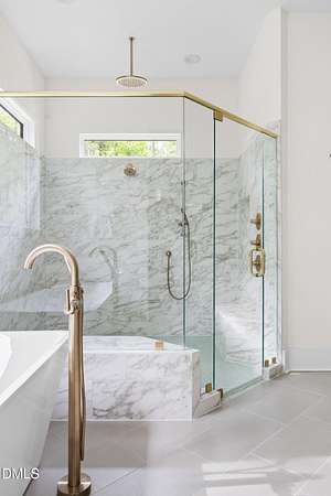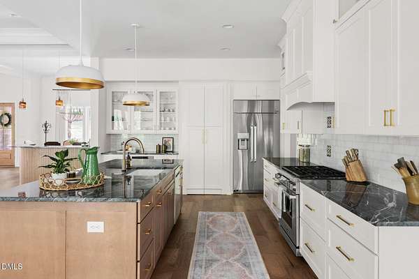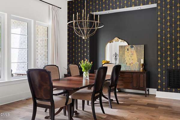 Turn-key, better than new, custom-built home nestled on 6.5 beautifully landscaped acres in Chapel Hill's Windfall Neighborhood. Built in 2022 with meticulous attention to detail, enjoy a gracious floor plan that features a main floor primary suite, main floor guest bedroom with en-suite, and main floor office...a winning and rare combo. The open-concept layout showcases an impressive family room with 12-foot coffered ceilings, built-in bookcases, and a linear gas fireplace, perfect for gatherings. The gourmet kitchen equipped with high-end Dacor appliances features a large center island offering counter seating, ample cabinetry with walk-in pantry for ease and convenience, and marble backsplash. Adjacent is a bright breakfast area, surrounded by windows offering serene views of the private backyard. Showstopping screened porch with built-in Coyote grill and hood vent, Phantom screens, and Eze-breeze for true year-round enjoyment. Formal dining space and adjacent dry bar beckons entertaining. Cozy up in an additional gathering space on the main level featuring a vaulted ceiling and expansive windows providing canopy views of the lush landscape. The main floor primary suite is a true retreat with tall ceilings and bountiful light. Enjoy a luxurious ensuite bath with double vanities, soaking tub, walk-in shower, and deluxe walk-in closet with custom built-ins. Two additional bedrooms with private bathrooms on the second level. Epoxy garage equipped with EV charger, providing plenty of space for vehicles & more. A mudroom with custom built-ins, a laundry room of your dreams with it's ample size and storage. Sealed crawl space offers peace of mind. Easy to access walk-in attic storage. Zoned for Seaforth High School. Located less than two miles from Jordan Lake's scenic trails and water sport activities, featuring 150 miles of magnificent shoreline. Come see for yourself, embrace the lifestyle you've dreamed of - you won't want to leave!