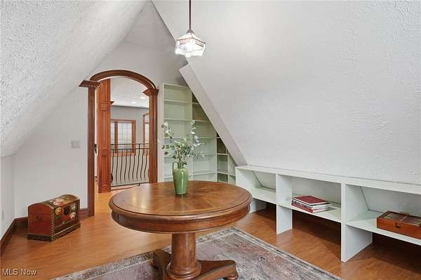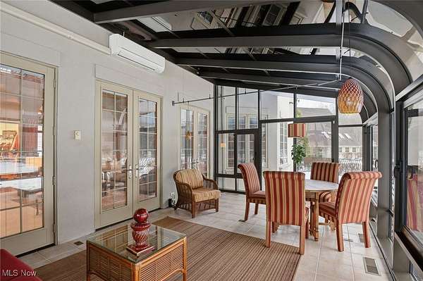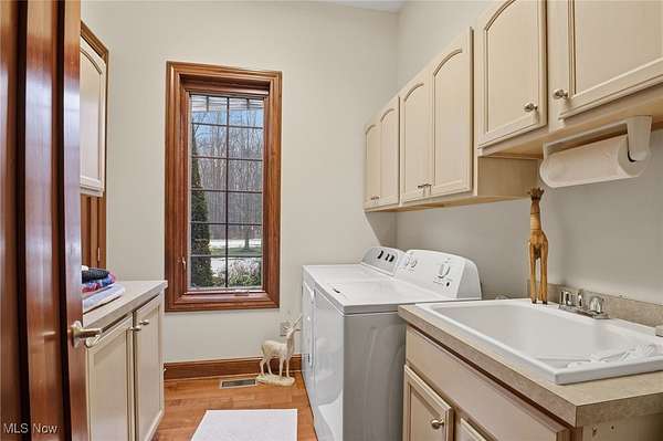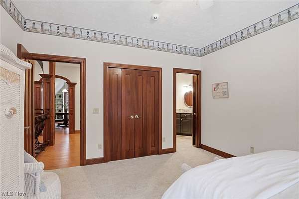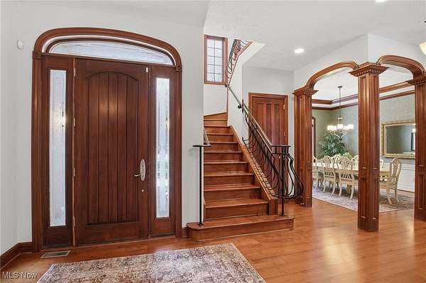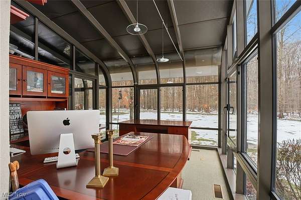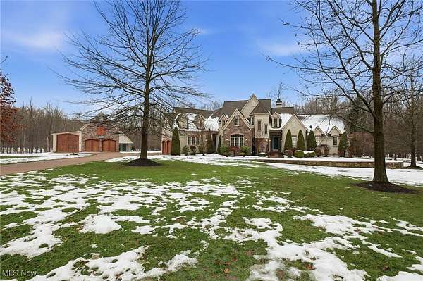 Offering 4 bedrooms, 3.5 baths, and over 4,000 square feet, this distinctive estate is tucked behind a brick driveway on nearly four private acres, delivering exceptional privacy, space, and architectural presence. Inside, a soaring two-story great room sets the tone, where expansive windows flood the home with natural light and frame views of the surrounding landscape. The space flows seamlessly into the custom kitchen, anchored by an oversized island and thoughtfully designed for both effortless entertaining and everyday living. A formal dining room and sun-filled four-season room extend the living space, creating an easy rhythm between gathering, retreat, and connection to the outdoors. The four-season sunroom and adjacent private office, surrounded by windows, offer a peaceful vantage point overlooking the grounds, with direct access to a stone patio ideal for outdoor entertaining and quiet evenings alike. A first-floor primary suite provides a private retreat, complete with a spa-inspired bath, soaking tub, walk-in shower, and generous closet space. Additional conveniences include first-floor laundry and a large full basement offering endless potential. Upstairs, a graceful staircase leads to a library loft, additional bedrooms with a Jack-and-Jill bath, and abundant storage, including a spacious attic. A separate living suite with its own private bath and secondary entrance adds valuable flexibility for guests, extended stays, or multi-generational living. The property is further enhanced by six-car garage capacity, including a heated outbuilding with workshop space, pull-through parking, and covered patio-offering exceptional utility while maintaining a serene estate setting. Conveniently located near shopping, dining, wineries, Lake Erie recreation, and the Spire Institute, this home offers estate-style living with space, privacy, and thoughtful design-rarely found in today's market.