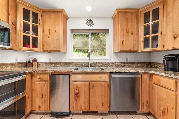 - Dishwasher, Double Oven, Dryer, Free-Standing Range, Hard Surface Counters, Microwave, Refrigerator, Trash Compactor, Washer