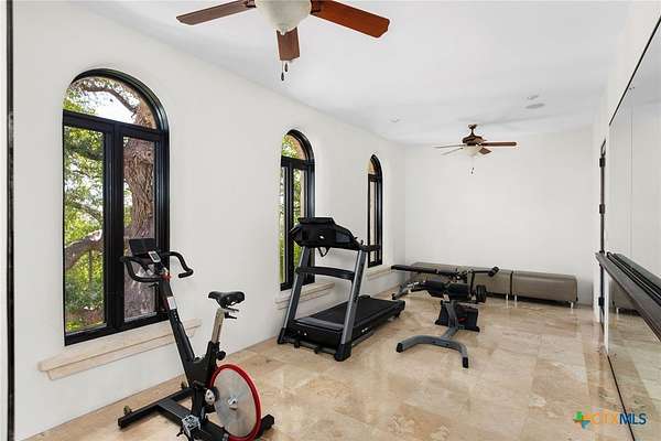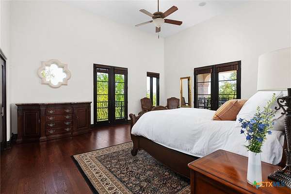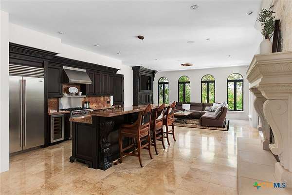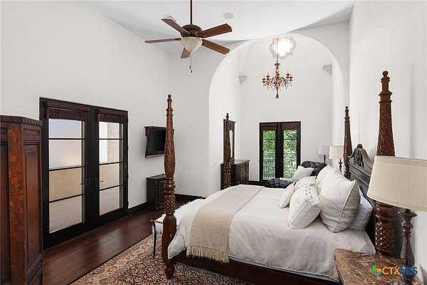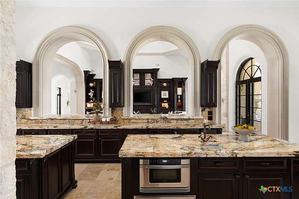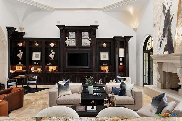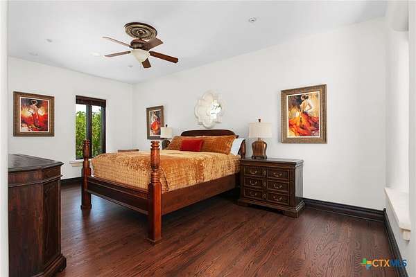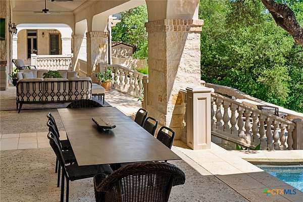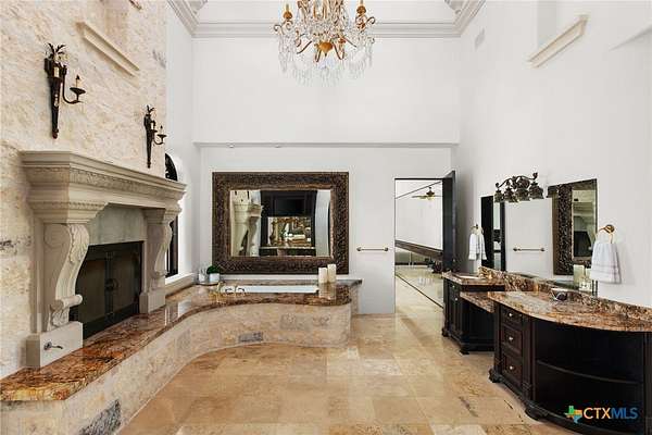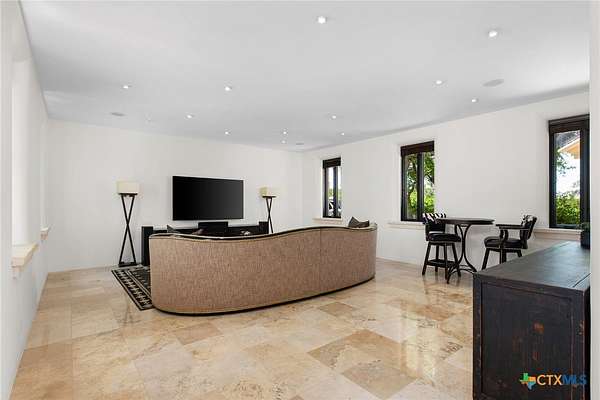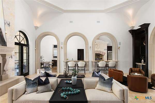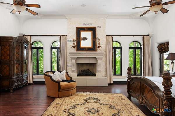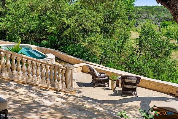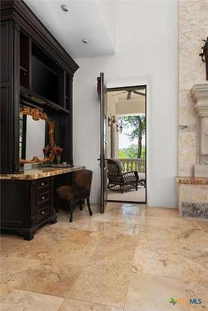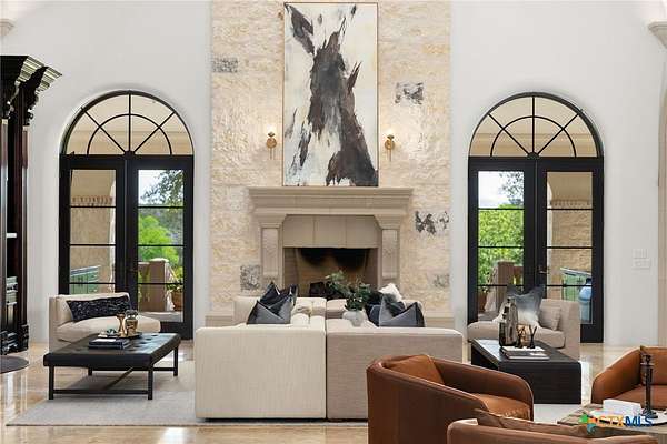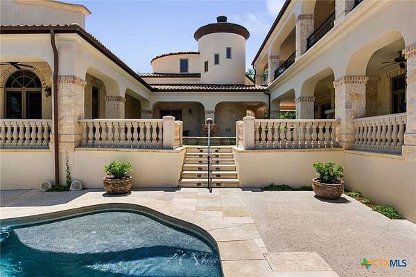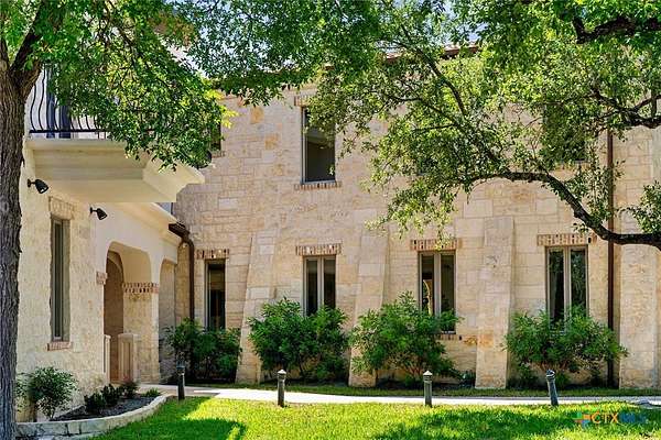 Introducing an architectural marvel that redefines luxury living with its innovative Mediterranean-inspired design. Follow the gated, tree-lined driveway as it guides you to the expansive 10-acre estate. Enter the 8,926 sq ft main house & be greeted by exquisite travertine floors, stunning archways, & soaring ceilings that elevate the ambiance to unparalleled heights. The inviting family room is adorned with custom built-ins & a striking floor-to-ceiling fireplace, creating a cozy yet elegant atmosphere. The family room transitions into a gourmet kitchen equipped with dual islands, custom cabinetry, built-in wine storage, granite countertops, dual sinks, & stainless-steel appliances including a 6-burner gas range, warming drawer, 2 Subzero refrigerators, catering to the most discerning culinary aficionados. Indulge in unparalleled luxury within the primary suite, where opulence meets comfort. 2 separate, lavish bathrooms, each boasting expansive walk-in closets in addition to a private gym, offering a sanctuary for wellness & rejuvenation. Beyond, a private lounge beckons with a full kitchen, providing the perfect setting for intimate gatherings or moments of relaxation. Connected to the main house by a covered walkway adorned with a captivating courtyard & 3 fountains, the 2,526 sq ft guest house offers its own slice of paradise. Outside, discover expansive living areas seamlessly integrated with 2 pools & a large spa featuring a cascading waterfall, all set amidst lush manicured grounds irrigated by the Blanco River, ensuring lush greenery year-round. For recreation, indulge in a game of basketball on the sports court or venture down to the crystal-clear Blanco River, where a private section awaits, perfect for swimming or kayaking. Additionally, a large fenced area provides secure storage for boats, tractors, RVs, & more, discreetly tucked away from view. Experience the epitome of luxury living amidst the serene beauty of this majestic estate.