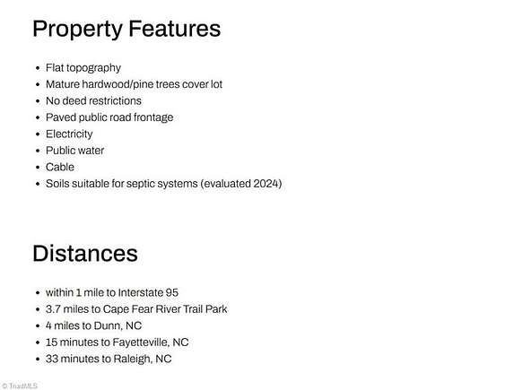 Est $372/mo1.7 acre unrestricted lot located on a paved, public road in Dunn, Harnett County, North Carolina covered with a mixture of mature hardwood and pine trees, and access to electricity, cable, public water and soils that would support a single conventional septic system (evaluated 2024). Less than 1 mile to Interstate 95, 3.7 miles to Cape Fear River Trail Park, 4 miles to Dunn, 15 minutes to Fayetteville, 33 minutes to Raleigh, NC. Visit listing agent's website for more info, watch video tour and use interactive map
