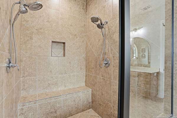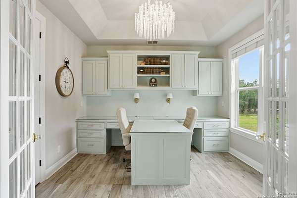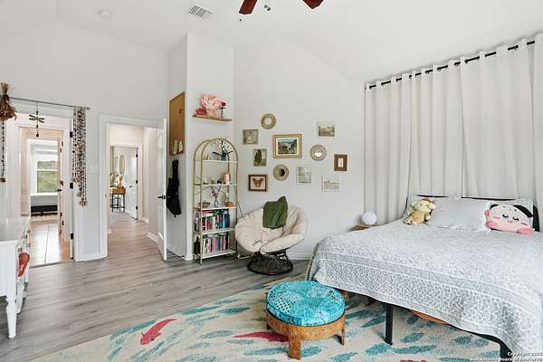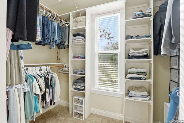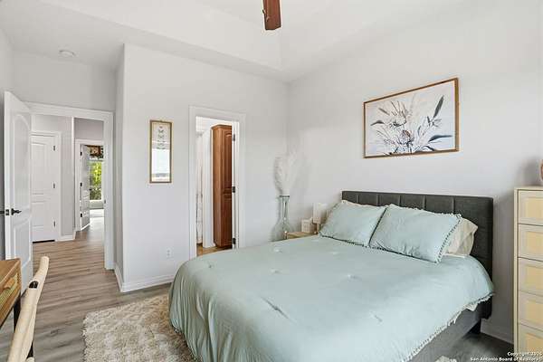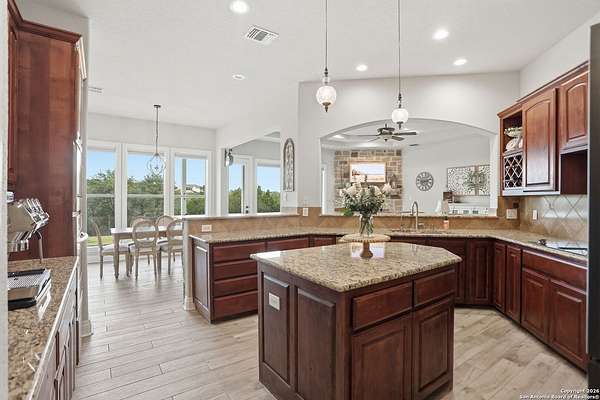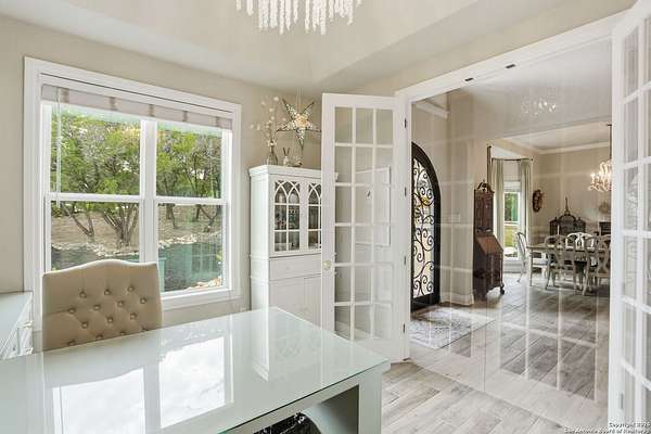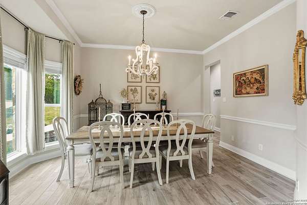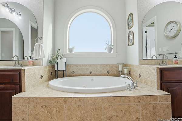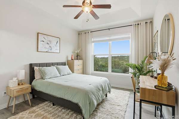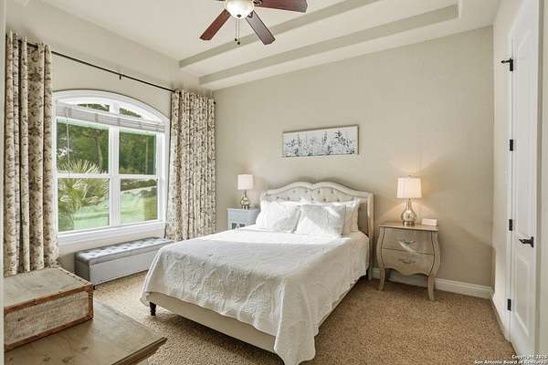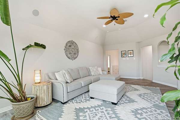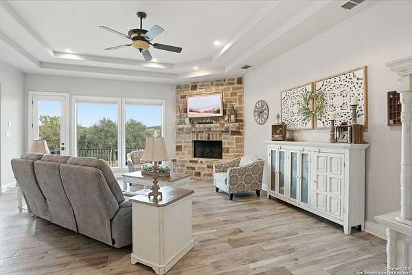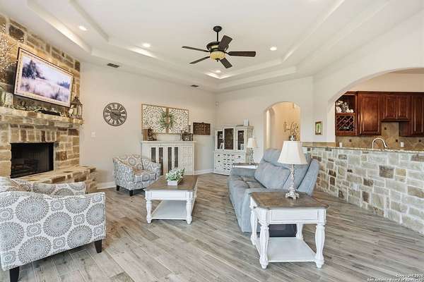 Stunning Hill Country Retreat in Laurel Canyon Ranch....Welcome to this exceptional five-bedroom, 4.5-bathroom Hill Country home nestled in Laurel Canyon Ranch, set on 3.5 acres backing to a greenbelt and located on a quiet cul-de-sac. Enjoy privacy, space, and breathtaking views within a neighborhood offering a 600-acre nature preserve, fishing pond, and walking trails. Wildlife sightings and serene surroundings make this property truly special. A dramatic 22-foot entry and foyer with a curved staircase creates an unforgettable first impression-perfect for showcasing a 12-foot+ Christmas tree. The home features 10-foot ceilings and 8-foot interior doors throughout, enhancing the open and airy feel. The spacious island kitchen includes a walk-in pantry and flows seamlessly into the breakfast nook and living area, highlighted by a stone fireplace and expansive back windows overlooking the covered porch and fenced backyard. The main-floor primary suite offers floor-to-ceiling windows and direct access to the covered porch. The Texas-sized primary bathroom features a barrel ceiling, double vanities, oversized shower, jetted garden tub, and abundant storage. Also on the main level are a second bedroom with a walk-in closet and bathroom, a formal dining room, a half bathroom, and a dedicated office with a wall of built-in desks-ideal for working from home. Upstairs you'll find three additional bedrooms, all with walk-in closets, two full bathrooms (including a Jack-and-Jill), and a large second living area with direct access to the second-story balcony, where the views truly shine. To top it all off, this home offers exceptional long-term value and peace of mind with a 2025 roof, updated 6-inch gutters, and two solar-powered Attic Breeze systems completed in September 2025. These major upgrades not only enhance energy efficiency and durability but also significantly reduce future maintenance costs. The transferable warranty adds even more value, making this home a smart and secure investment for the next owner. Additional Features & Upgrades: *Oversized 2-car garage with insulated doors and mini-split system *Fenced backyard with sprinkler system *Mature trees and thousands of dollars on landscaping *Central vacuum system, reverse osmosis system, and water softener *13 oversized windows replaced in 2023, many floor-to-ceiling *Wood plank porcelain tile throughout lower level (2024) *Waterproof luxury vinyl upstairs (2023) *Two hot water heaters (March 2025 & August 2025) *Five updated toilets (2023) *Dishwasher (August 2022) *Fiber internet currently being installed for the entire neighborhood *9 minute drive to the new HEB at Culebra and 211! This home truly has it all. Schedule your private showing today.