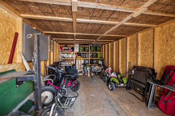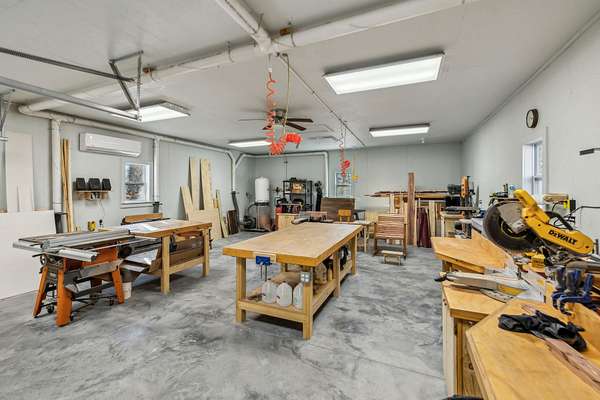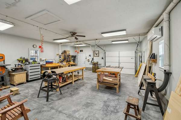 The property includes a detached 2-car garage with RV cover, a 24x12 storage shed, and a heated/cooled woodworking shop with 200-amp service--ideal for hobbies, equipment, or creative space.