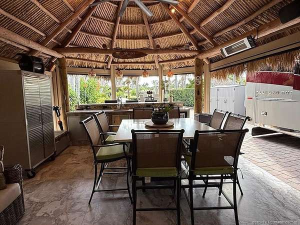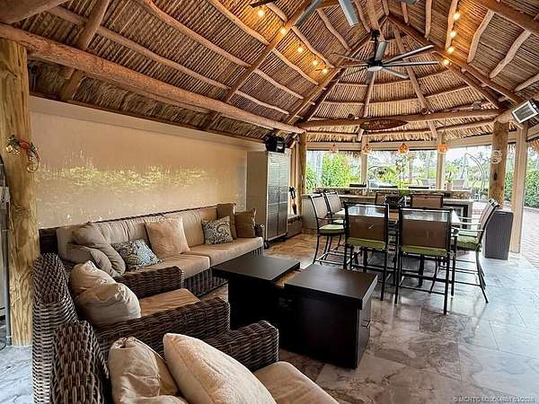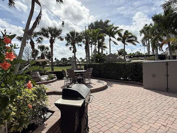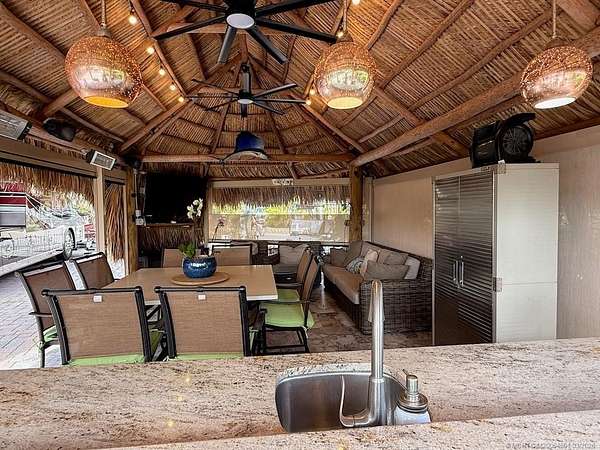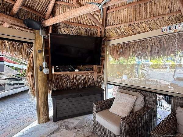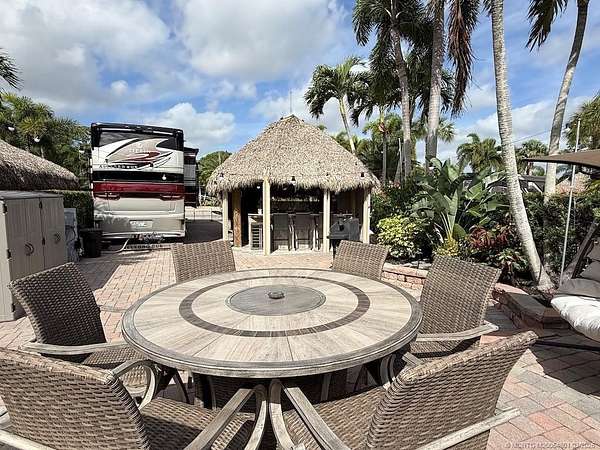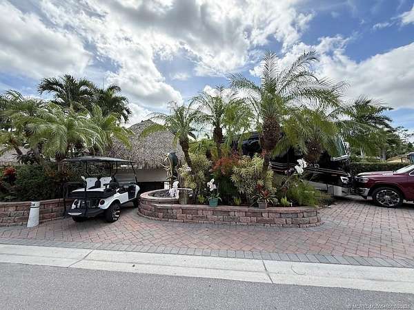 Welcome to one of the most beautiful lots in the resort! This oversized 3,757 sq ft corner lot is perfectly positioned along the golf course, offering peaceful views of the lake and fountain, all framed by mature landscaping for added privacy. The large tiki with its soaring roofline creates a cozy, shaded living space, ideal for relaxing or entertaining, with plenty of room to spread out. The custom kitchen features granite countertops, a refrigerator, wine chiller, ice maker, and dishwasher-all beautifully finished with rustic barn board-style porcelain tile for a warm, inviting look. Outside, you'll find a raised circular seating area with a fire pit table-just one of the many private spots to unwind or host friends while still enjoying the tranquil golf course backdrop. With multiple areas for entertaining and plenty of space to make your own, this lot comes fully furnished, including grill and storage units. Park your coach, kick back and start enjoying the good life!