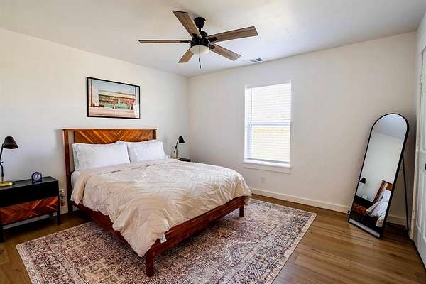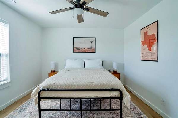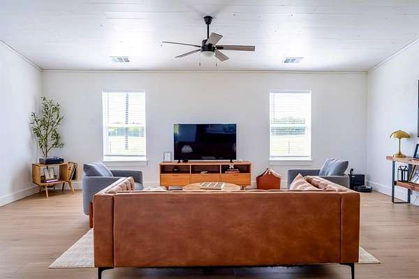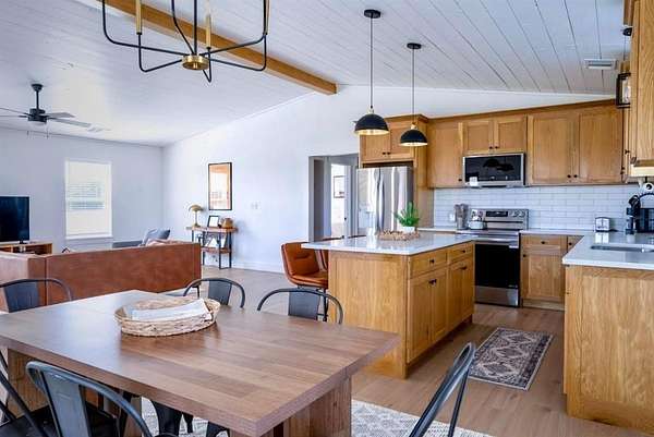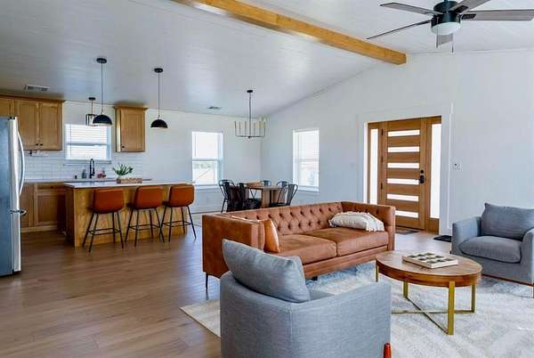 This Texas proud 1,200 square foot barndo, looks like Chip and Joanne bult it and features an open-concept design with a vaulted shiplap ceiling, modern kitchen with a large quartz topped island, and a spacious dining area. Bedrooms are ample and the layout is functional and ideal for full-time living or a weekend retreat. Your pets will appreciate the fence around the home.