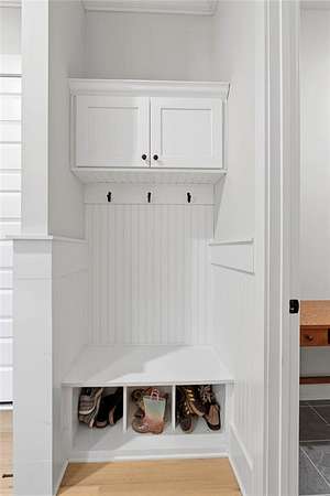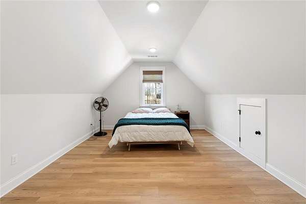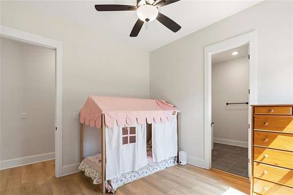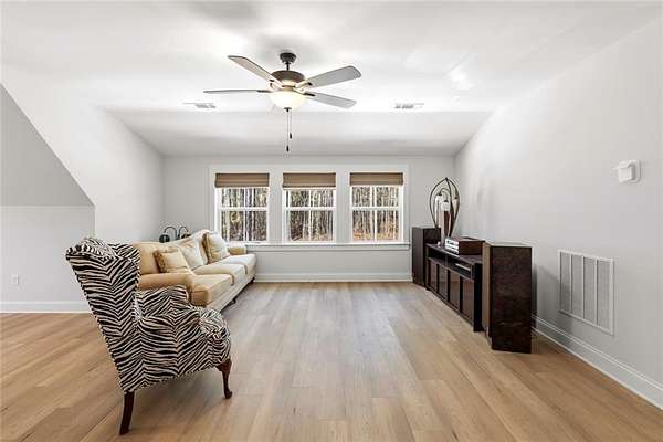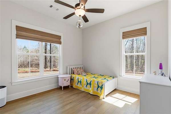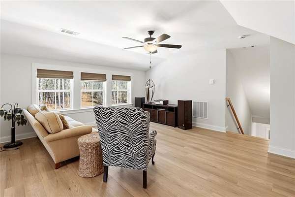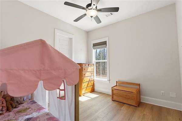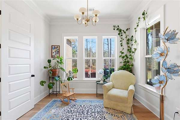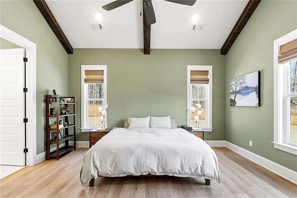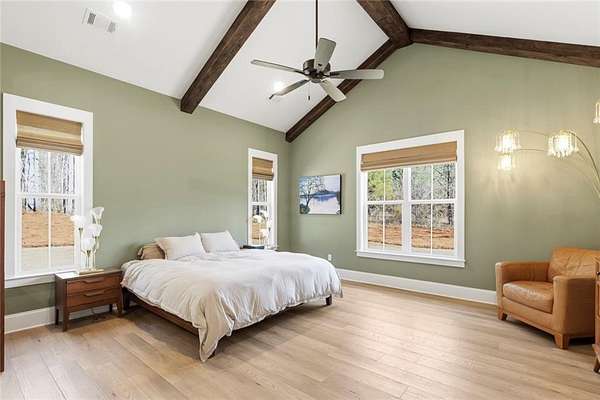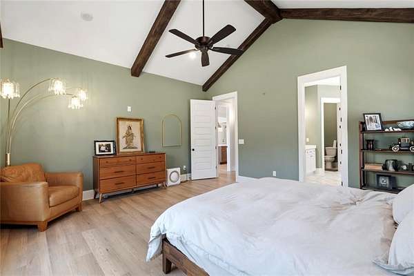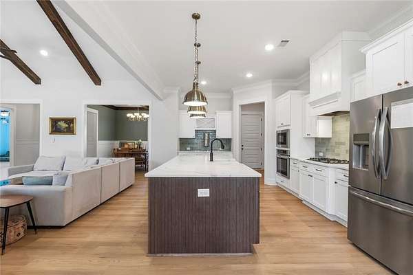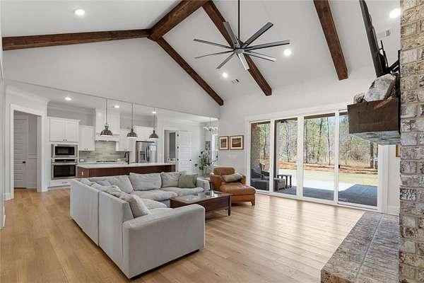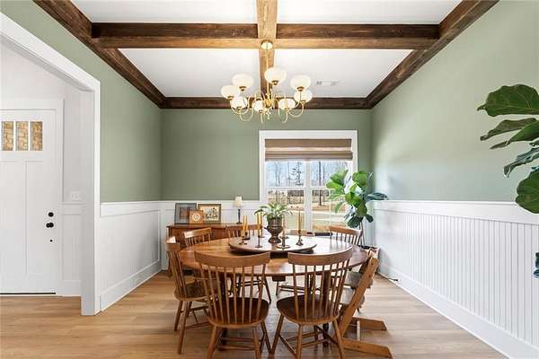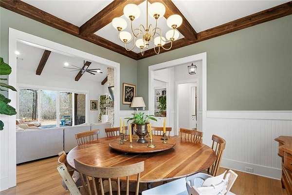 The open-concept layout is enhanced by hardwood flooring throughout—no carpet—offering a clean, cohesive look and easy maintenance. The attention to detail continues into the dining room and primary bedroom, both featuring beautiful wood beam accents that elevate the overall design.