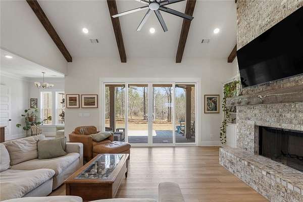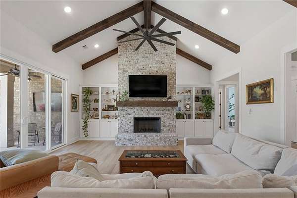 Welcome to 4260 Firefly Bend, where thoughtful design and custom craftsmanship come together on a private 1.91-acre cul-de-sac lot. From the moment you enter, the spacious great room showcases soaring vaulted ceilings accented with stunning stained wood beams, along with a striking gas fireplace featuring brick that extends all the way to the ceiling. Custom built-ins on both sides of the fireplace add both function and character to the space.