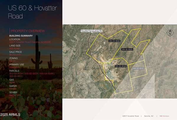 ROCK-SOLID INVESTMENT | OWN AN ESTABLISHED AGGREGATE AND MINERAL MINE! SITE FEATURES: - Independently owned turnkey aggregate mine with unobstructed access and use - 400 TOTAL acres - See ''Private Remarks'' for ALL parcels - Operational since 1896, patented in 1904 - Land surrounded by BLM and over 2 miles from the nearest home - Potential 150 million minable tons - 20 Patented claims - ADOT-approved materials site - Currently zoned RA-40 with state mining permits and zoning permitting various industrial uses including cement, asphalt, mineral and heavy metal recovery plans and inert materials landfill - Off-grid 640-sf housing on property converts easily to office - Located between US 60 and I-10 on Hovatter Road " Near rail service and strong growth of Phoenix West Valley " Due Diligence Documents Availabl ADDITIONAL OPPORTUNITIES/USES " Mineral mining - The Rio del Monte is one of the few remaining unexplored gold-silver deposits in southern Arizona. It contains several shallow exploration targets which can be evaluated by relatively inexpensive percussion drilling methods. The high silica content of the gold-silver mineralization means that the copper smelters in Arizona may purchase the production for smelter flux provided it meets their specifications. In my opinion the Rio del Monte is a gold-silver deposit which merits further exploration. Source: Ted H. Eyde [Registered Geologist], Dan Eyde, Mark Johnson | 11/30/82 Version " Potential airstrip with 5,000 FT already outlined " Ability to maintain milling and storage facilities " Could make good horse property Demographics 10 Miles 30 Miles 50 Miles Population 1,621 3,977 19,005 Average Age 65.2 66.2 55.3 Average HH Income $61,420 $67,079 $72,543 Employed Population 336 979 6,320