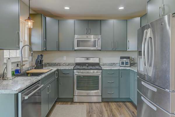 - Dishwasher, Dryer, Gas Range, Gas Water Heater, Microwave, Range, Refrigerator, Stainless Steel Appliance(s), Washer, Water Softener Owned