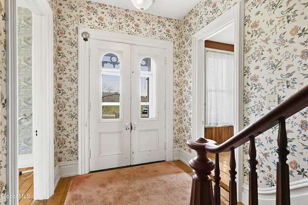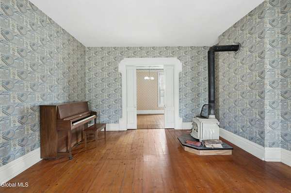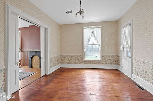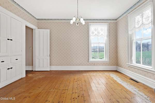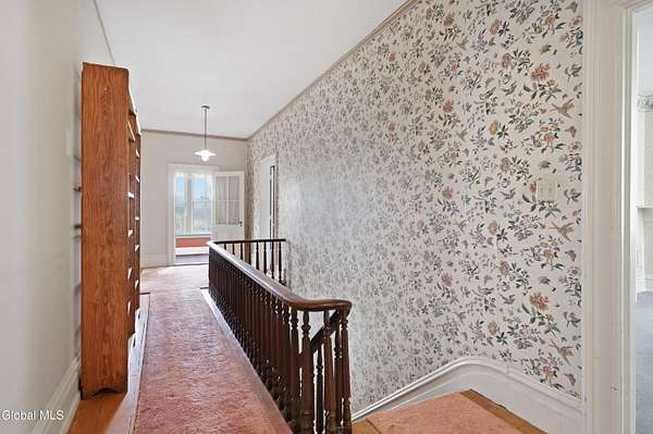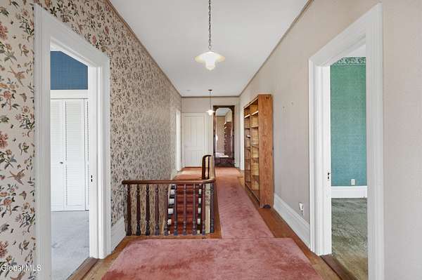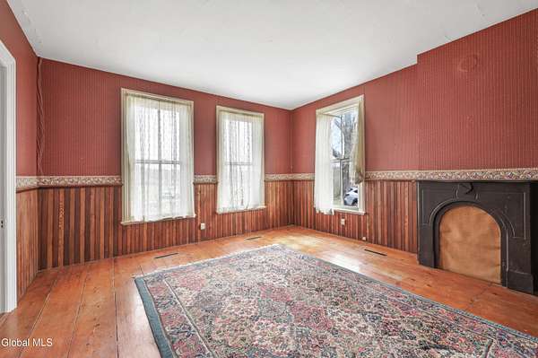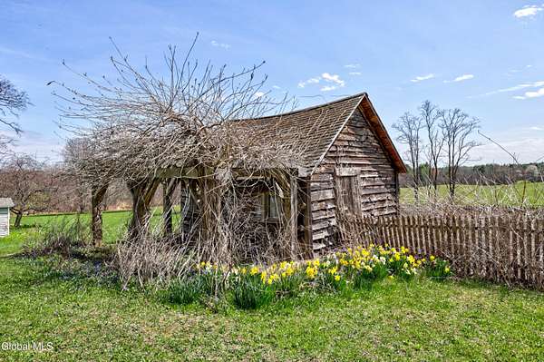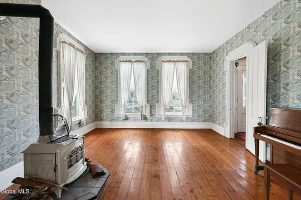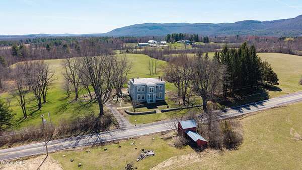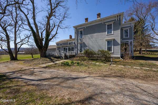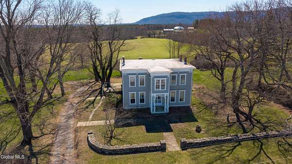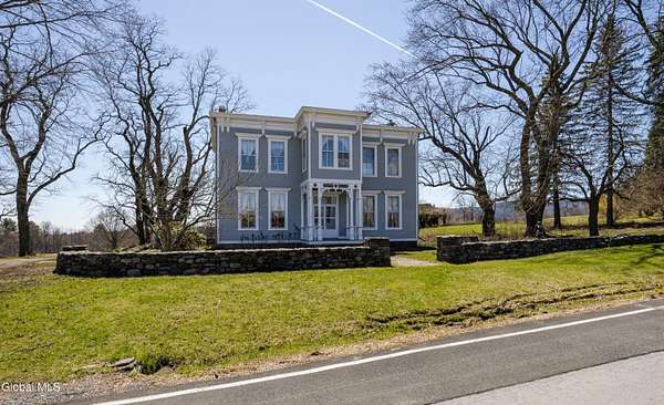 Step into a timeless blend of history and elegance with this remarkable 1800s Victorian Italianate estate, featuring an original section believed to date back to the 1700s. The front entrance welcomes you into a grand hall, where a magnificent walnut banister immediately showcases the home's exceptional craftsmanship and character. Throughout the home, impressively high ceilings enhance the sense of space and historic grandeur. Designed with both beauty and function in mind, the home features a stately office with pocket doors opening to a cozy sitting room. The living room flows seamlessly into the dining room through its own set of pocket doors, framed by intricately crafted woodwork that reflects the artistry of a bygone era. Just off the kitchen, the original section of the home now serves as a study, centered around a striking, oversized wood-burning fireplace complete with a traditional cooking crane--a rare and authentic historical feature. Solid, wide-plank floors run throughout, tying each room together with warmth and continuity. A convenient first-floor laundry combined with a half bath adds modern practicality. Upstairs, you'll find 5 bedrooms and 2 full baths, offering ample space for family and guests. Beyond the home, 116 picturesque acres stretch out toward the dramatic backdrop of the Helderberg Escarpment. Rich in history, the property is said to have been owned by brothers Matthias and Matthew Frederick, who purchased it in 1789 from Stephen Van Rensselaer; both brothers served in the Revolutionary War. The land has been thoughtfully maintained as a hobby farm, ideal for growing hay or simply enjoying a peaceful rural lifestyle. A small pond adds to the calming enjoyment of this unique property. The most recent owner, a master gardener and landscaper, has left a lasting legacy in the form of vibrant flower gardens & a carefully designed vegetable garden to be protected from wildlife.
